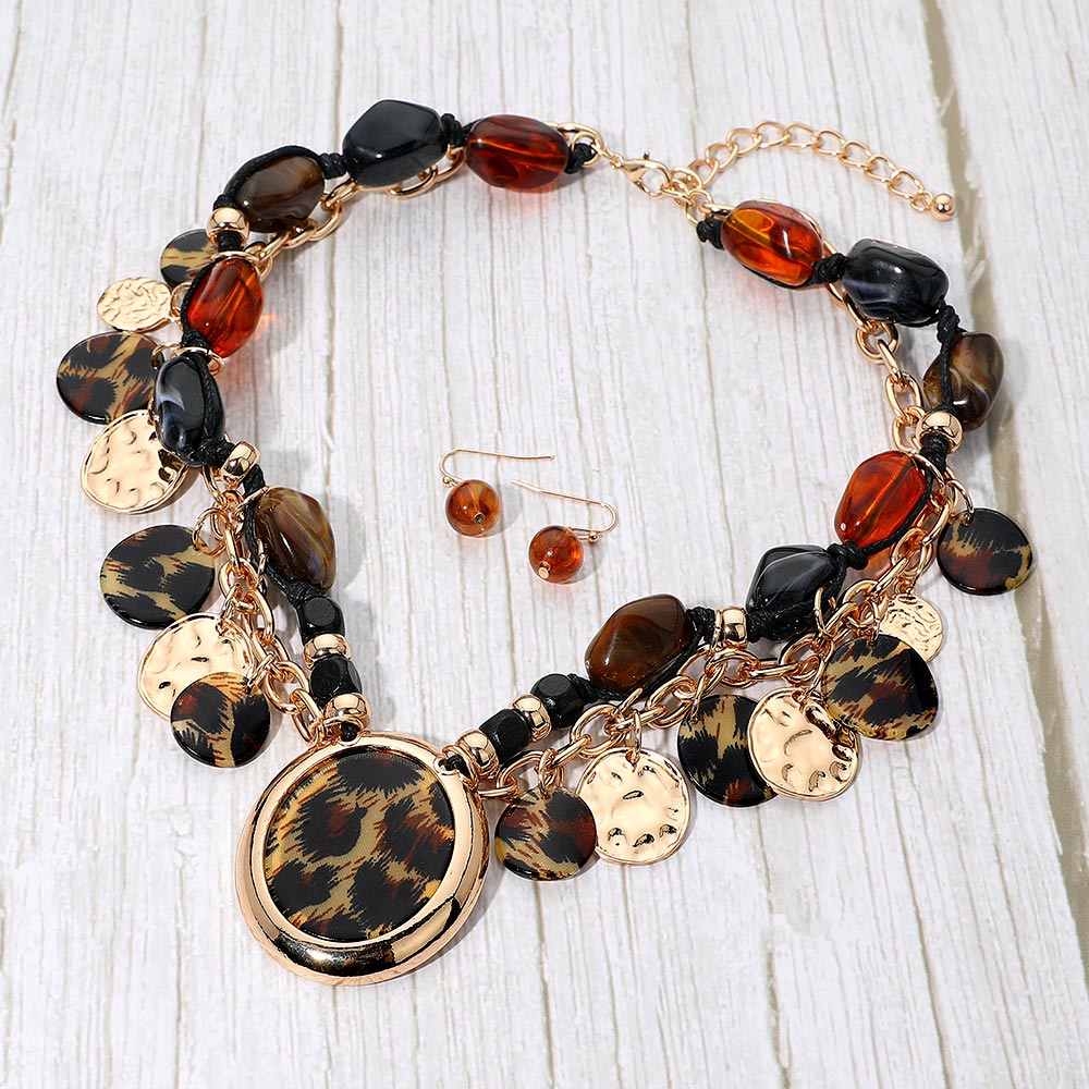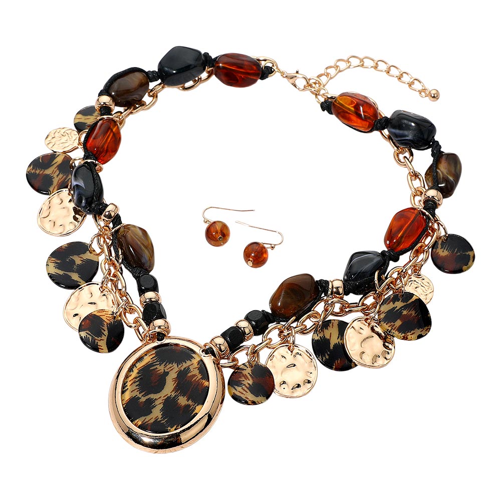 Details • Necklace Size : 19" + 3" L • Decor Size : 2" L • Earrings Size : 1" L • Stand out with this layered charm necklace and earring set featuring a striking mix of patterned medallions, textured discs, and glossy beads. Its bold, fashion-forward design adds dynamic movement and rich detail, making it the perfect statement accessory for elevating any outfit with effortless flair. • Lead and Nickel Compliant