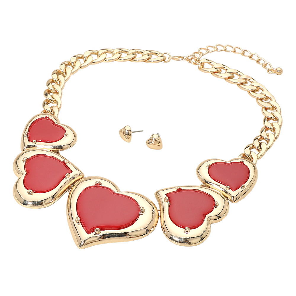 Details • Necklace Size : 17" + 3" L • Decor Size : 2" L • Earrings Size : 0.4" L • This bold heart statement necklace and stud earring set features oversized heart accents paired with a sleek chain silhouette for high visual impact. Designed for trend-driven styling, it is perfect for boutiques, gifting moments, and statement looks that stand out in everyday wear or special occasions. • Lead and Nickel Compliant
