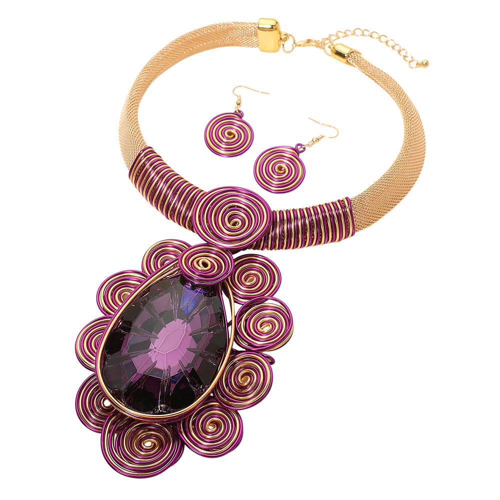 Details • Necklace Size : 18" + 2.5" L • Decor Size : 4" L • Earrings Size : 2.5" L • Make an impression with this bold teardrop statement necklace and matching earrings, featuring artistic swirl accents and a radiant centerpiece. Perfect for special occasions, parties, or elevating everyday fashion with a unique touch. • Lead and Nickel Compliant