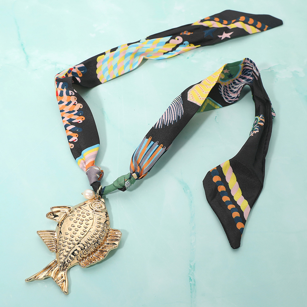 Details • Necklace Size : 31" L / Adjustable • Pendant Size : 2.5" X 3.5" • Print May Vary • Unique scarf necklace featuring a bold fish pendant and playful patterned fabric tie. Adjustable for comfort and style, this statement accessory combines chic charm with artistic flair, perfect for elevating everyday looks or standout fashion moments. • Lead and Nickel Compliant