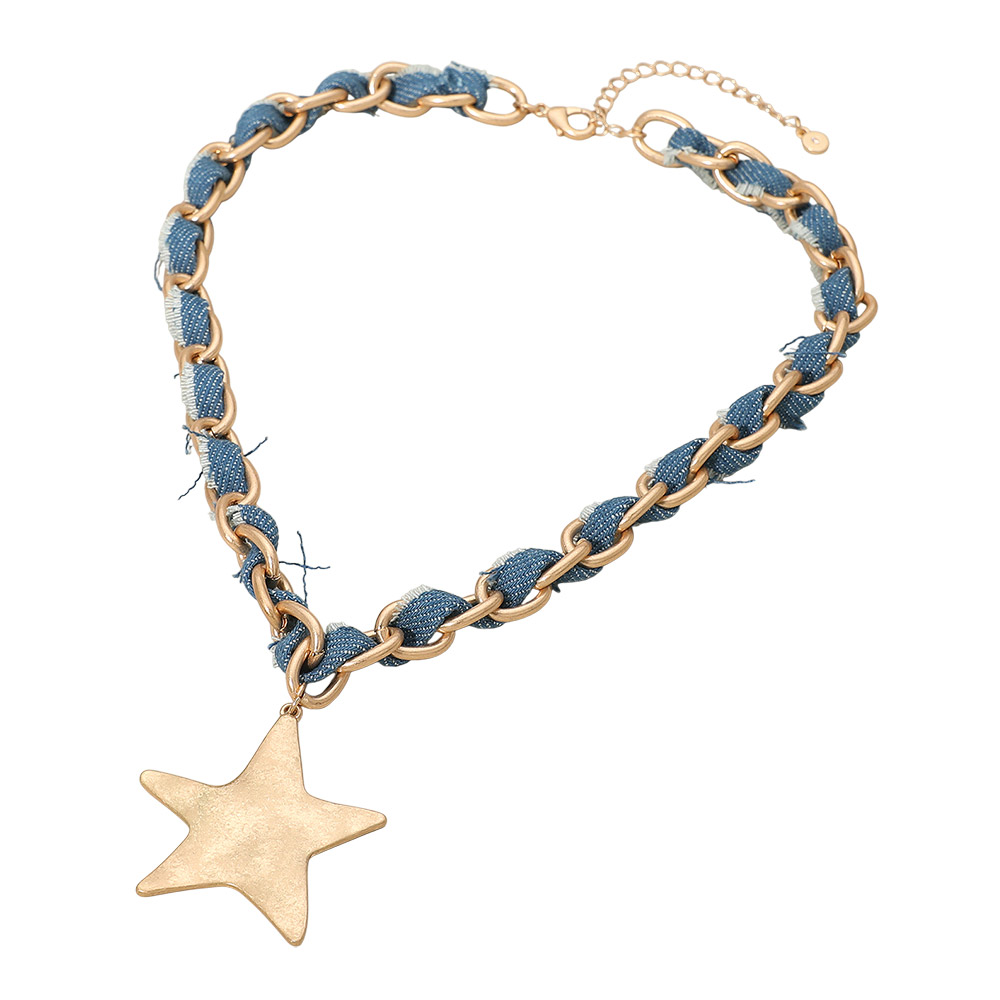 Details • Necklace Size : 18" + 3" L • Pendant Size : 2.3" L • Bold star pendant necklace featuring a textured charm on a stylish woven chain design. Its unique mix of links and fabric detail creates a standout accessory perfect for everyday wear or layered looks. A statement piece that adds personality and modern flair to any outfit. • Lead and Nickel Compliant