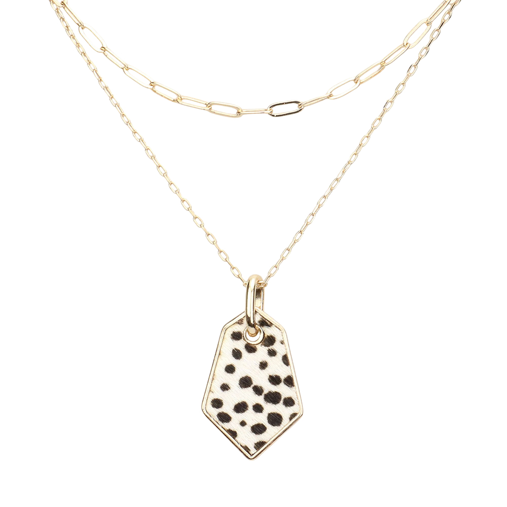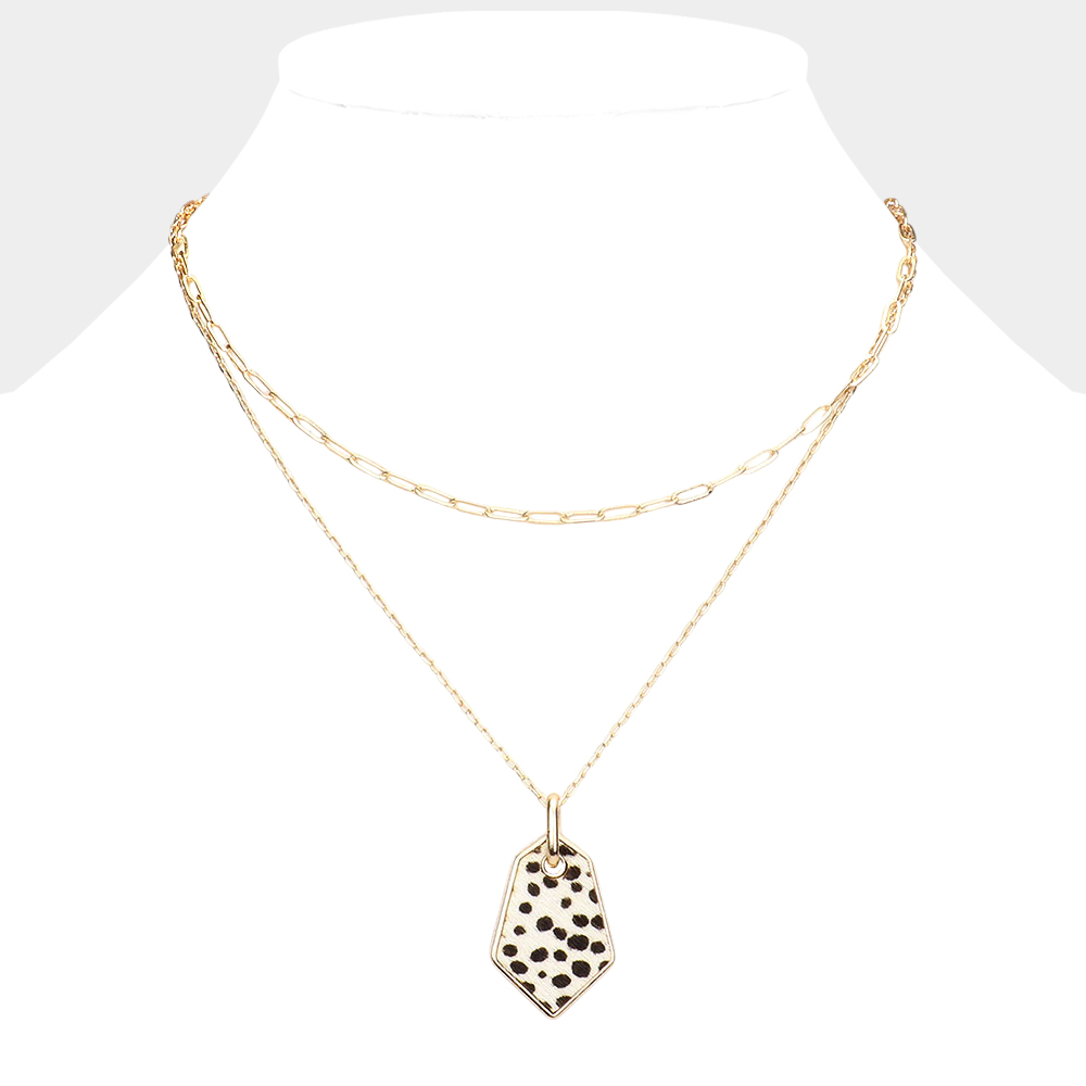 Leopard Patterned Genuine Leather Angled Pendant Double Layered Necklace