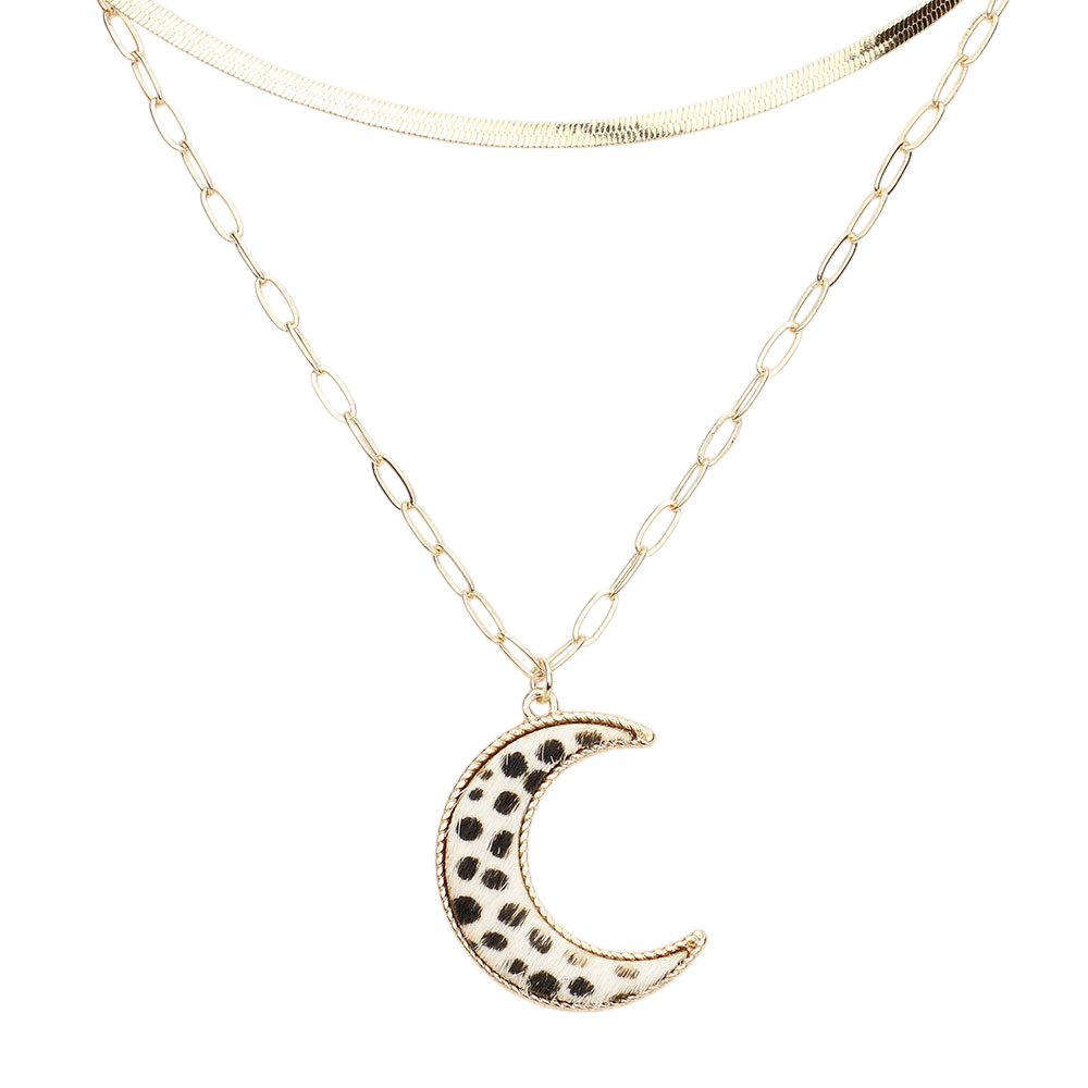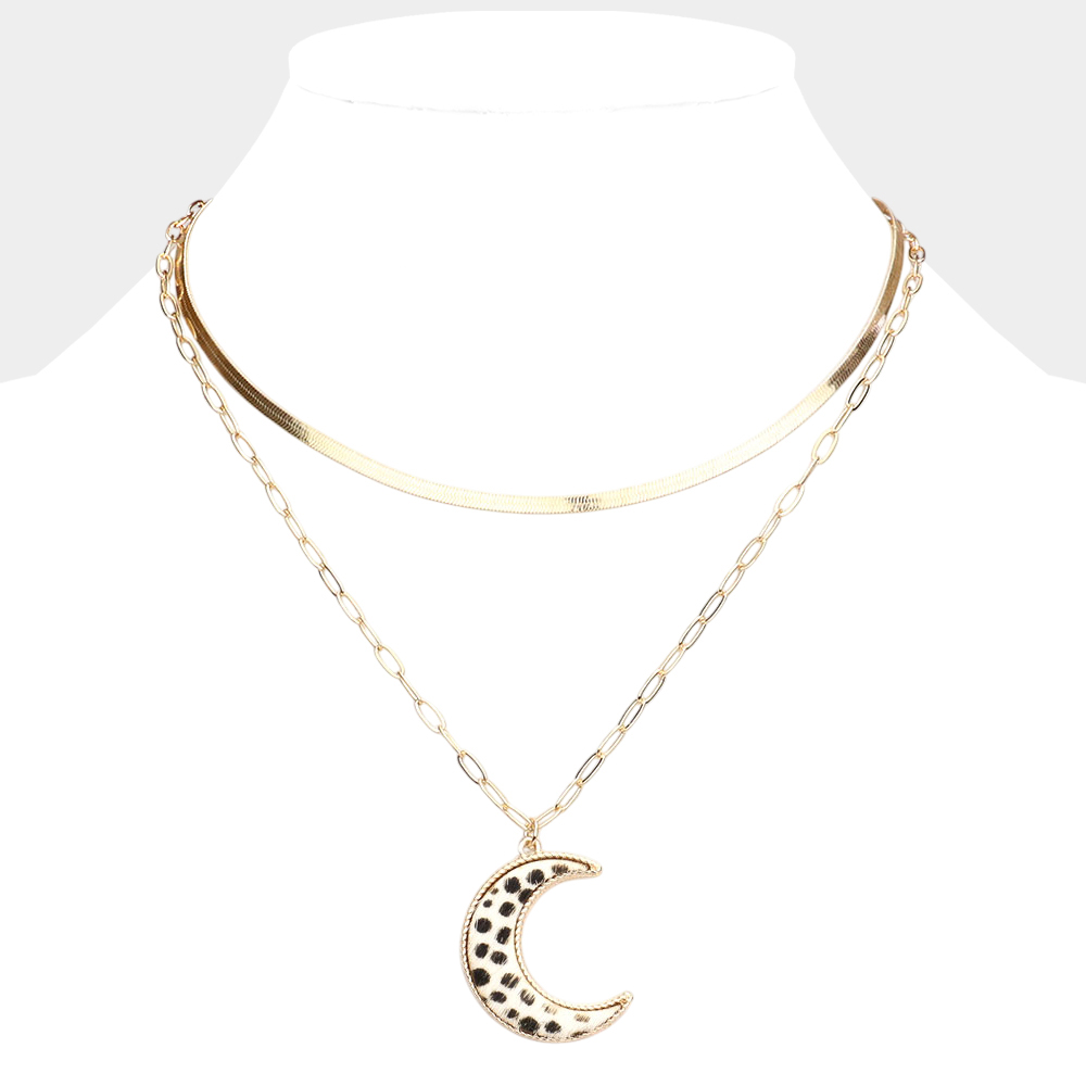 Leopard Patterned Genuine Leather Crescent Moon Pendant Double Layered Necklace
