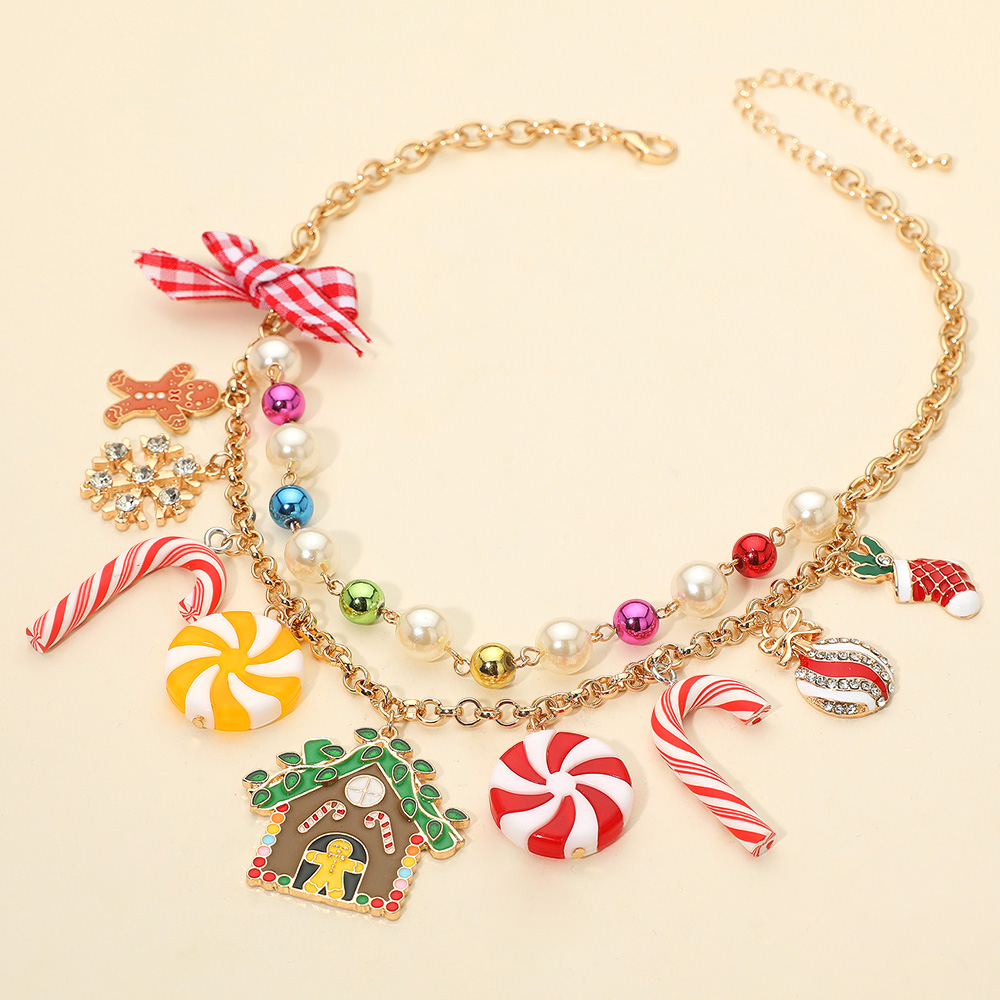 Details • Necklace Size : 16" + 3.5" L • Decor Size : 3" L • Add a touch of holiday cheer with this Christmas candy charm necklace featuring playful pendants like peppermint swirls, candy canes, and a gingerbread house. Fun, festive, and eye-catching, it’s the perfect statement accessory for holiday parties or joyful celebrations. • Lead and Nickel Compliant