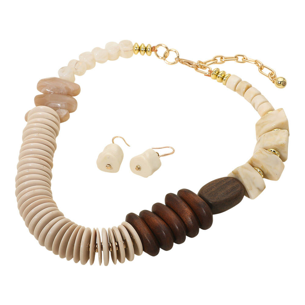 • Statement necklace and matching earring set featuring bold, mixed bead shapes arranged in a balanced, eye-catching design. This coordinated set delivers a modern statement look that elevates casual outfits and resort-inspired styling. Ideal for boutiques seeking unique, fashion-forward jewelry sets that add texture, dimension, and visual impact to curated accessory collections.