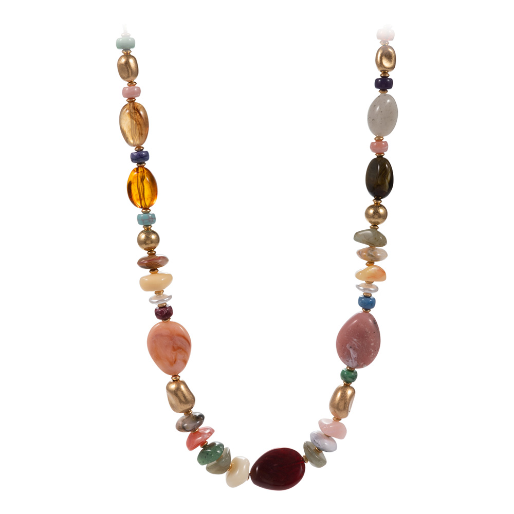 Details • Necklace Size : 18.5" + 3.5" L • Decor Size : 0.75" L • Add a playful touch to your look with this colorful beaded necklace featuring mixed shapes and polished finishes. Perfect for layering or wearing solo, this boho-inspired statement piece enhances casual outfits, parties, or special occasions with vibrant style. • Lead and Nickel Compliant