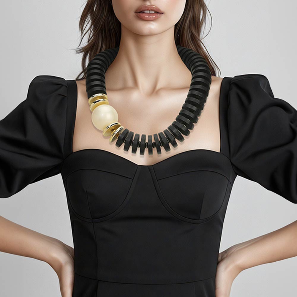 Details • Necklace Size : 22" + 1" L • Decor Size : 1.5" L • Bold statement necklace featuring stacked disc beads and a sculptural focal accent for a modern, high-impact look. Designed to add structure and dimension to any outfit, this piece works effortlessly for everyday styling or elevated occasions. A standout accessory ideal for boutiques seeking fashion-forward, trend-driven statement jewelry. • Lead and Nickel Compliant