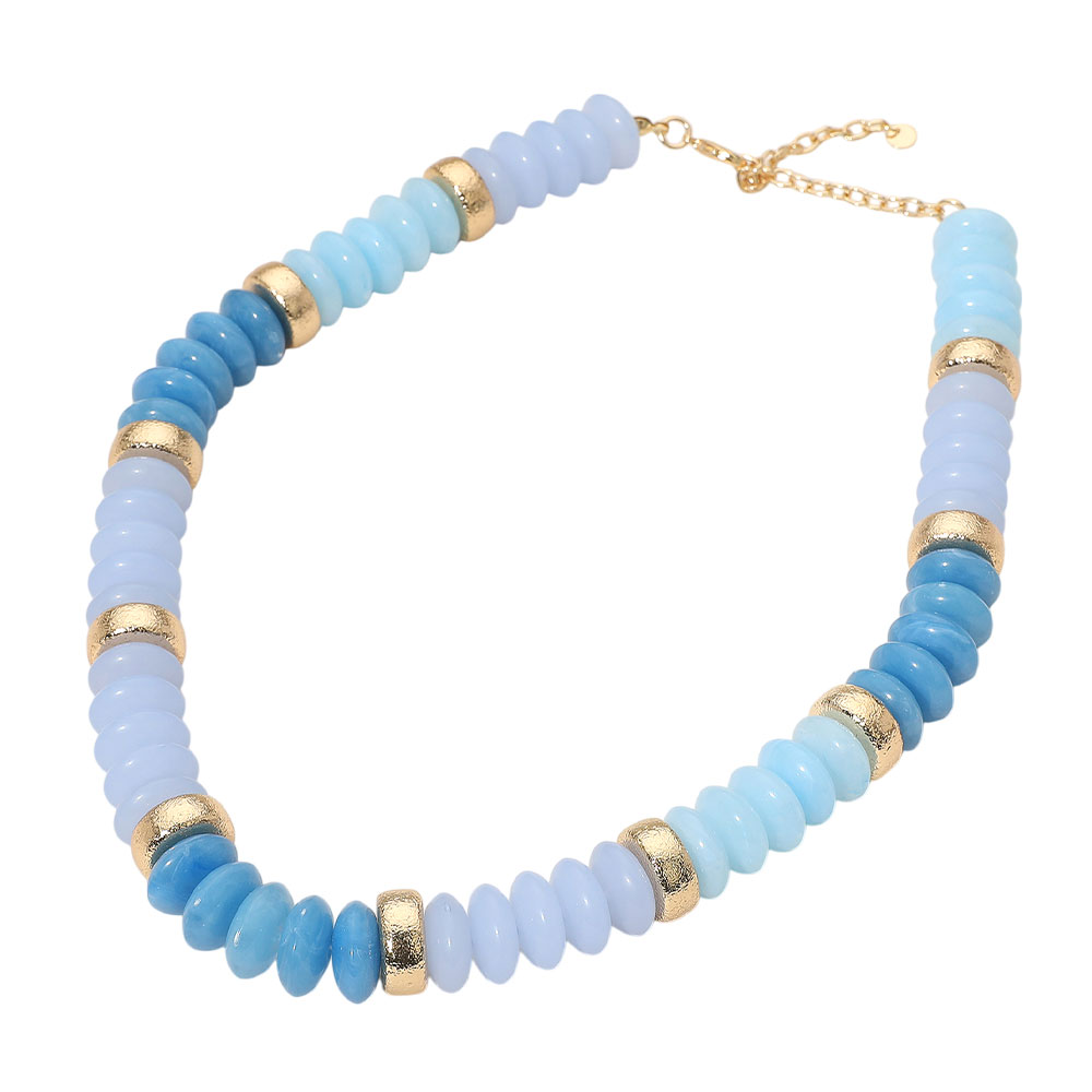 • Bold and contemporary, this chunky beaded necklace features smooth disc-shaped beads with metallic gold-tone spacers. A versatile statement piece that elevates any outfit with its sleek, modern design.