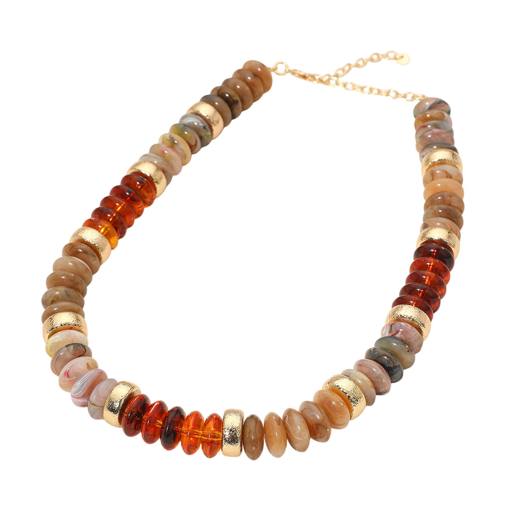 • Bold and contemporary, this chunky beaded necklace features smooth disc-shaped beads with metallic gold-tone spacers. A versatile statement piece that elevates any outfit with its sleek, modern design.