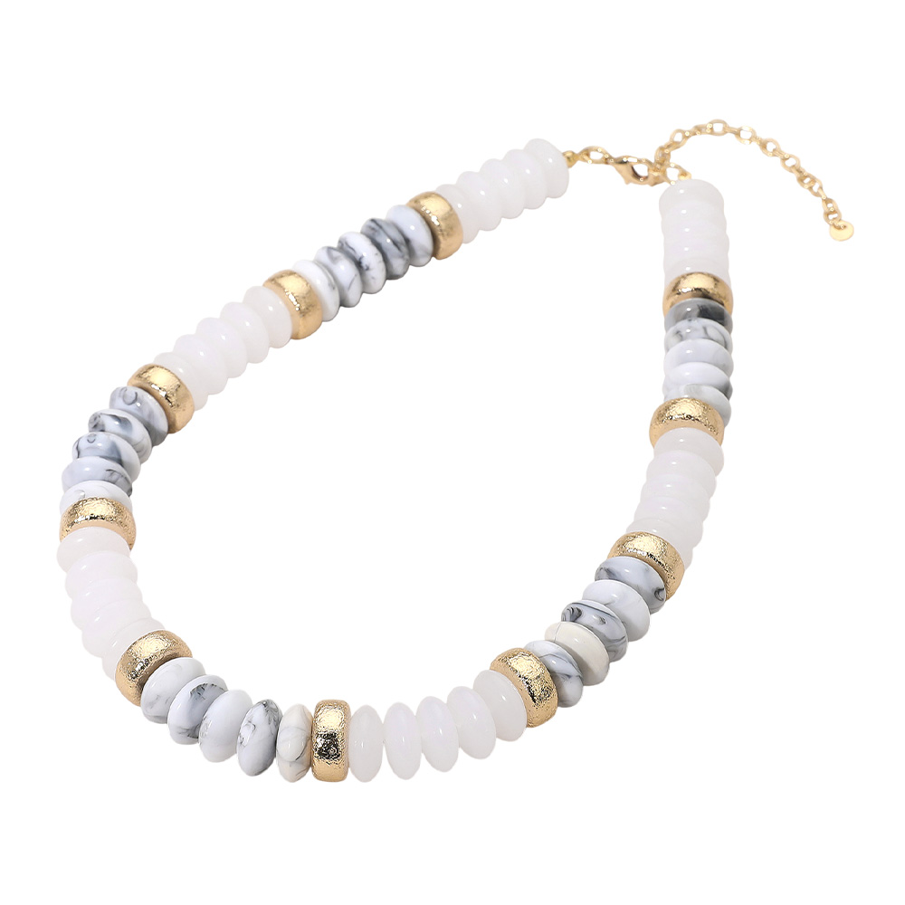 • Bold and contemporary, this chunky beaded necklace features smooth disc-shaped beads with metallic gold-tone spacers. A versatile statement piece that elevates any outfit with its sleek, modern design.