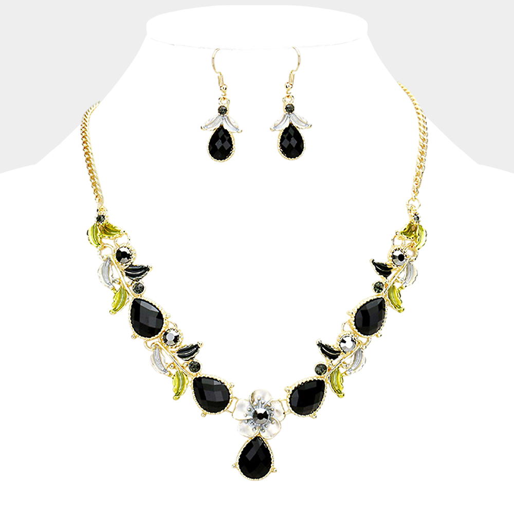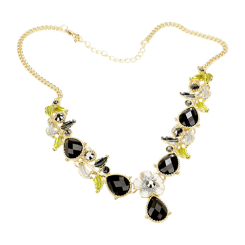 Colored Metal Flower Leaf Teardrop Stone Bib Necklace