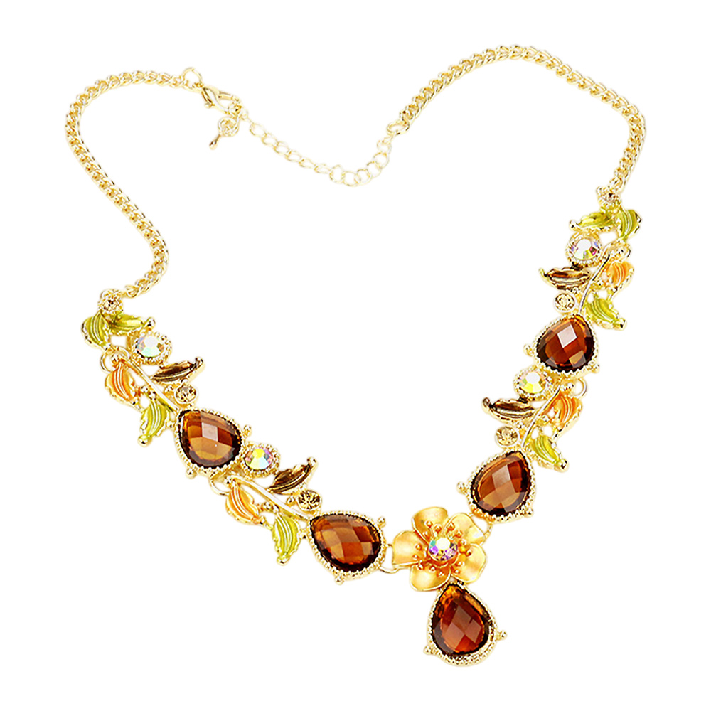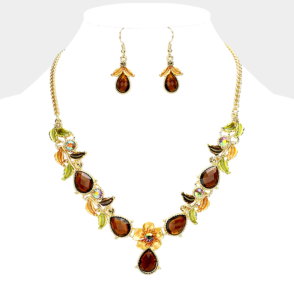 Colored Metal Flower Leaf Teardrop Stone Bib Necklace