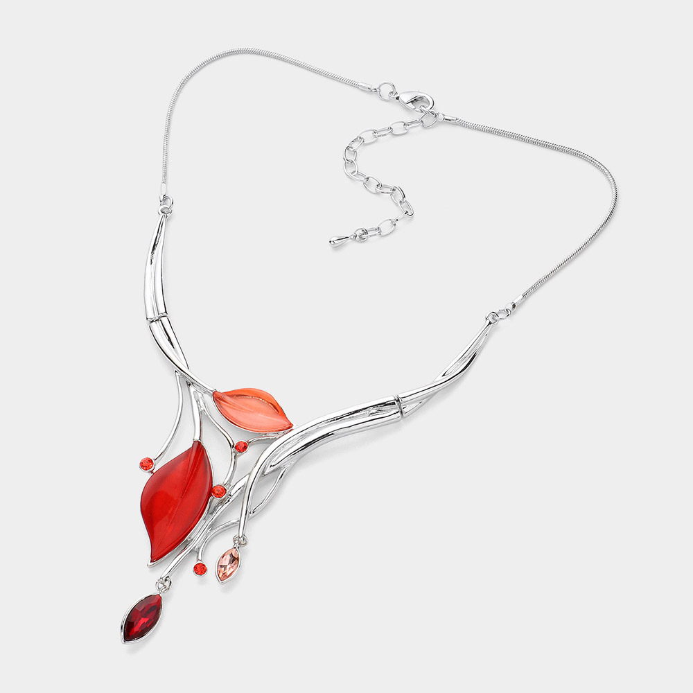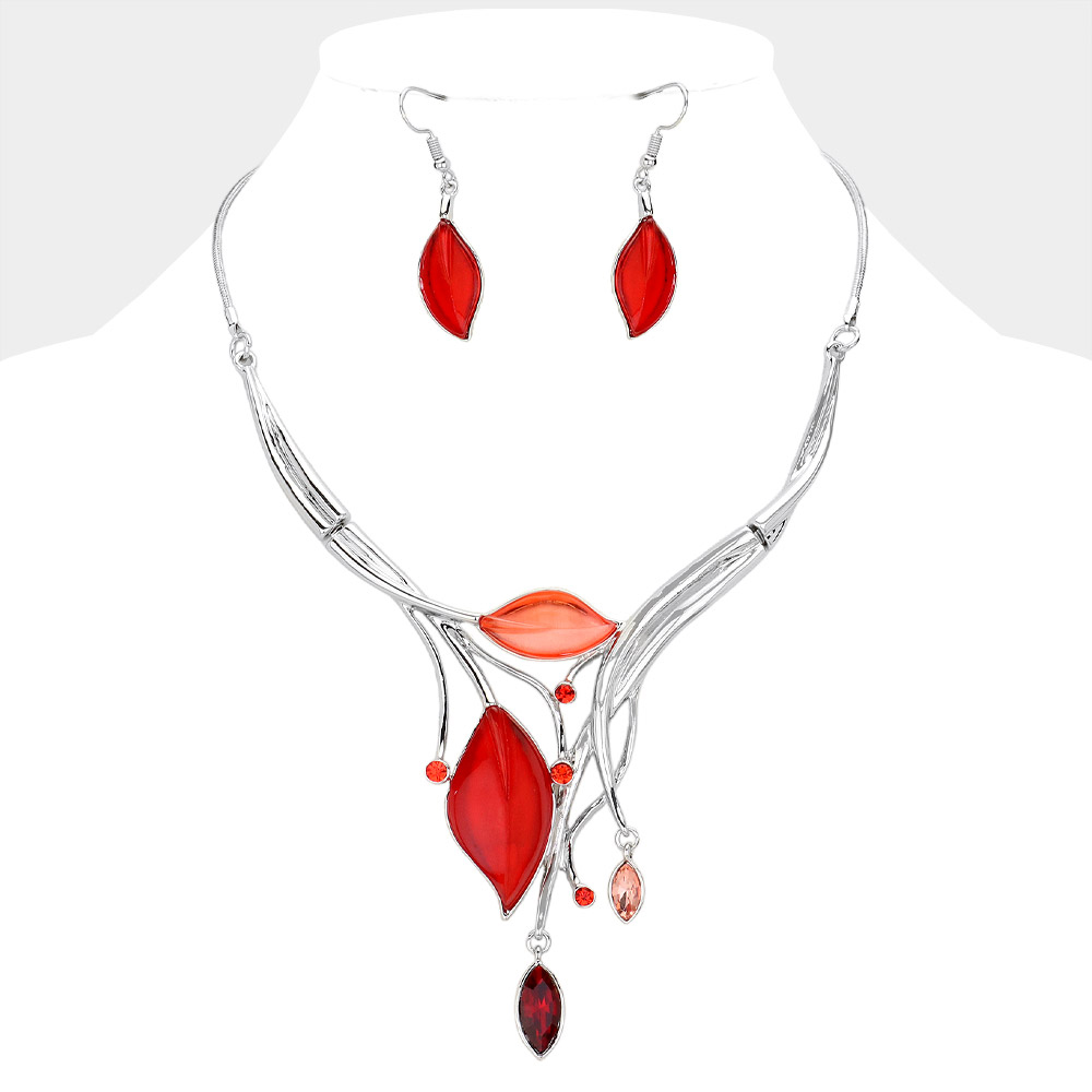 Details • Necklace Size : 17" + 3" L • Decor Size : 2.5" L • Earrings Size : 2" L • Elegant leaf pendant necklace with matching earrings featuring sleek metallic accents and delicate leaf shapes. This jewelry set adds a refined and feminine touch, perfect for formal occasions or stylish everyday wear.