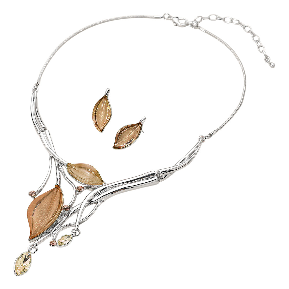 • Elegant leaf pendant necklace with matching earrings featuring sleek metallic accents and delicate leaf shapes. This jewelry set adds a refined and feminine touch, perfect for formal occasions or stylish everyday wear.