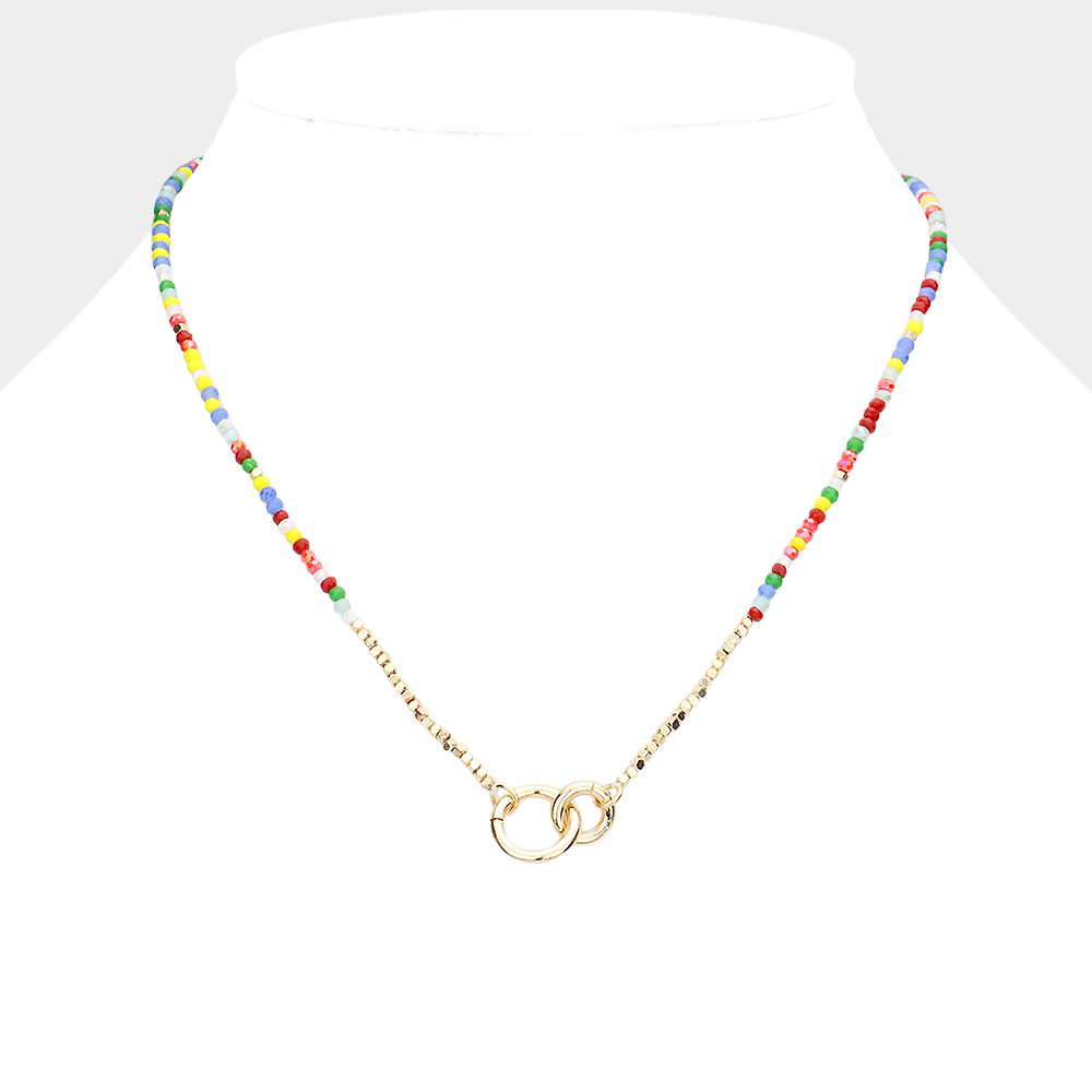 Double Open Metal Circle Link Pendant Faceted Beaded Necklace