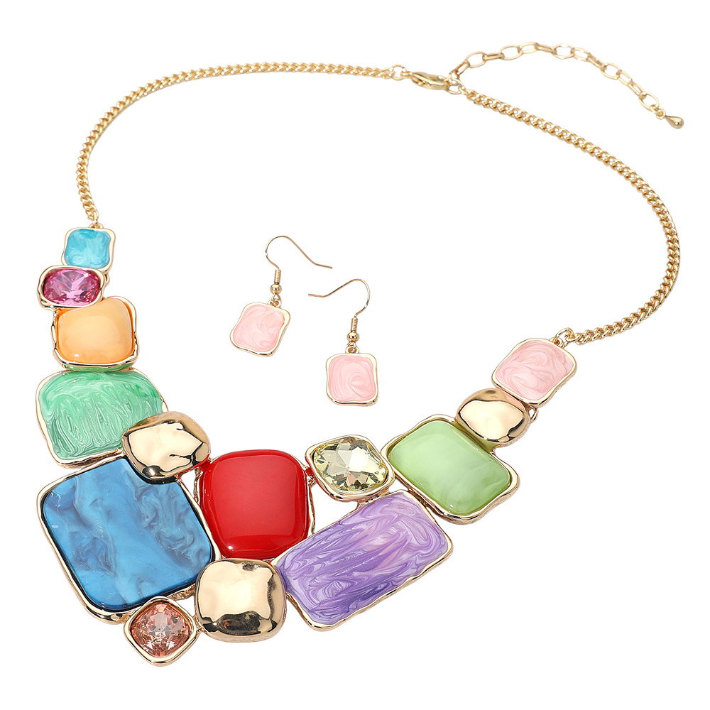 Details • Necklace Size : 18" + 3.5" L • Decor Size : 2.5" L • Earrings Size : 1.4" L • Modern statement necklace and earrings set featuring a mosaic of enamel geometric plate accents framed in metallic trim. The bold mix of smooth and marbled textures adds artistic flair, making it a standout accessory for elegant or contemporary fashion ensembles. • Lead and Nickel Compliant