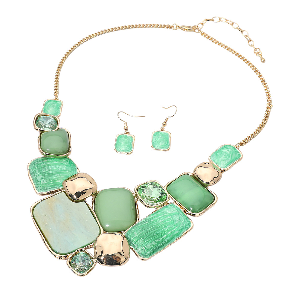 Details • Necklace Size : 18" + 3.5" L • Decor Size : 2.5" L • Earrings Size : 1.4" L • Modern statement necklace and earrings set featuring a mosaic of enamel geometric plate accents framed in metallic trim. The bold mix of smooth and marbled textures adds artistic flair, making it a standout accessory for elegant or contemporary fashion ensembles. • Lead and Nickel Compliant
