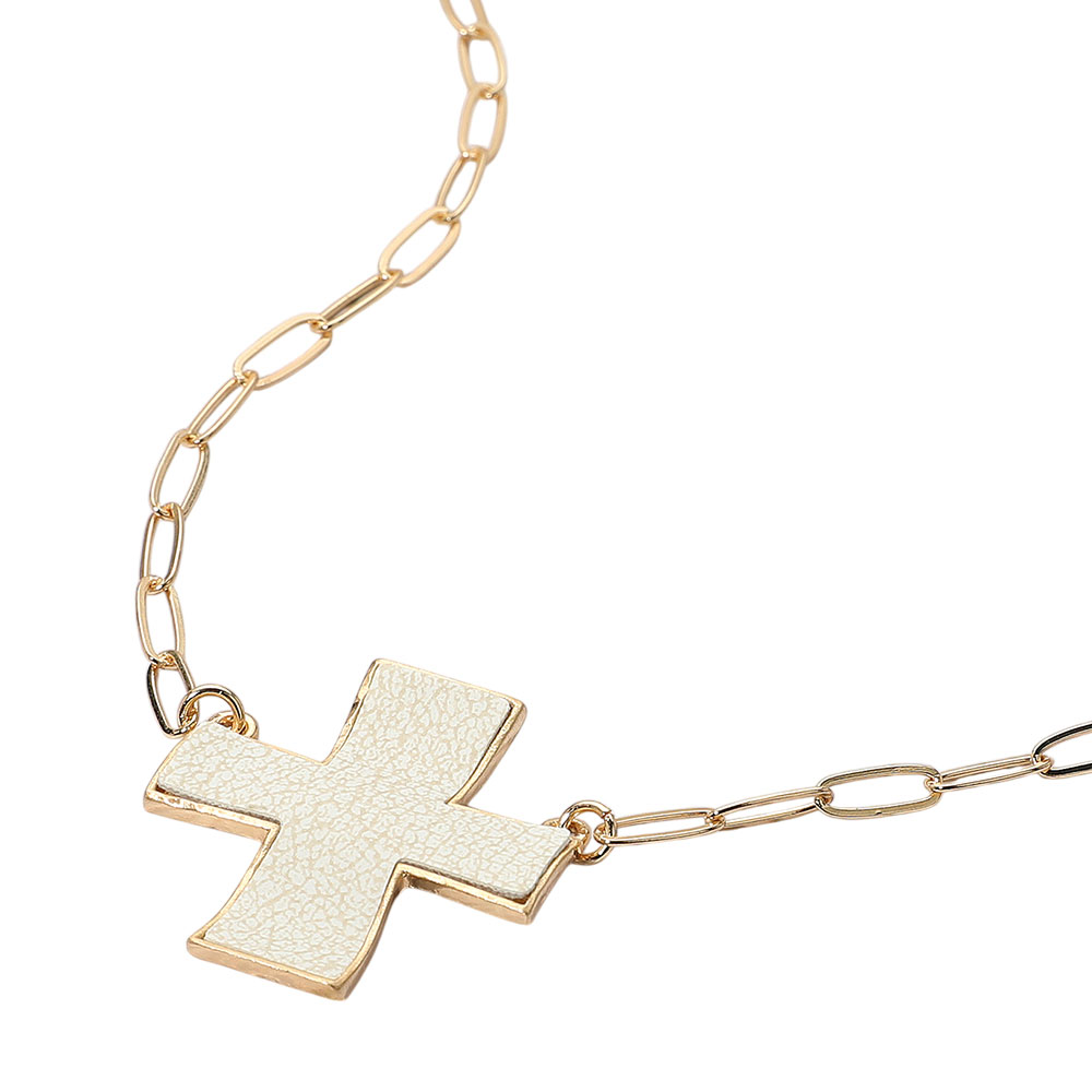 Faux Leather Cross Pendant Paperclip Chain Necklace