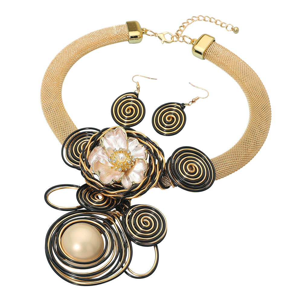 Details • Necklace Size : 18.5" + 3" L • Decor Size : 4.75" L • Earrings Size : 2" L • Make a dramatic impression with this floral spiral statement necklace and matching earrings. The bold spiral design and delicate flower centerpiece blend artistry and elegance, creating a captivating accessory set perfect for special occasions or standout fashion moments. • Lead and Nickel Compliant