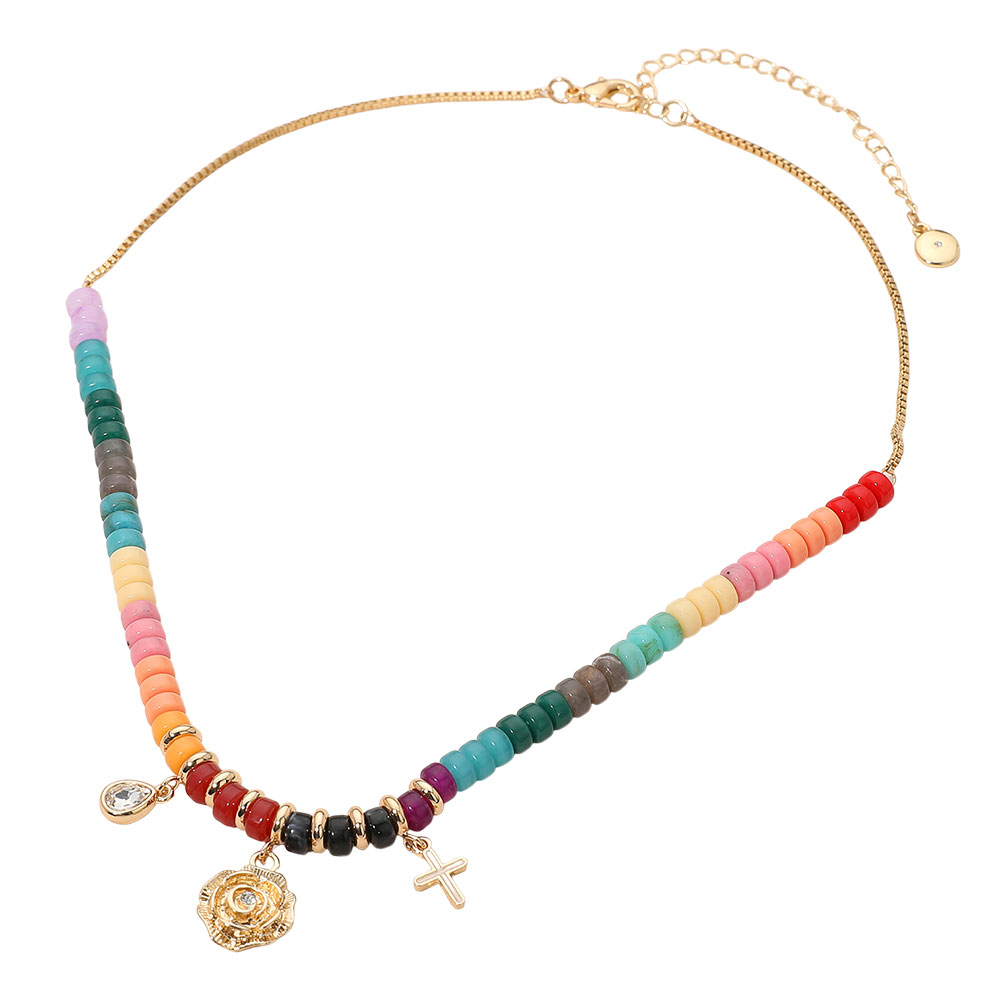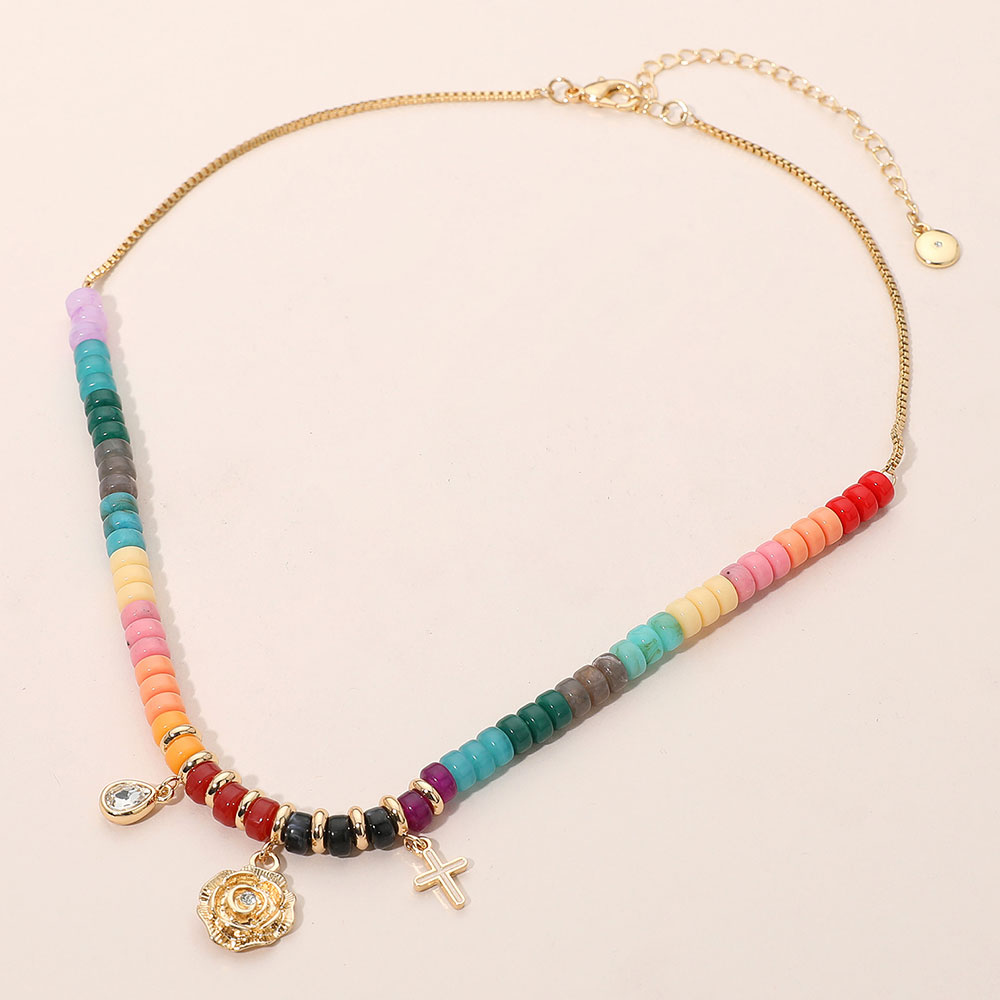 • Brighten your look with this multicolor bead charm necklace featuring vibrant tones and elegant gold accents. Adorned with symbolic pendants including a cross and medallion, this statement piece blends playful energy with refined style for a chic, expressive finish.