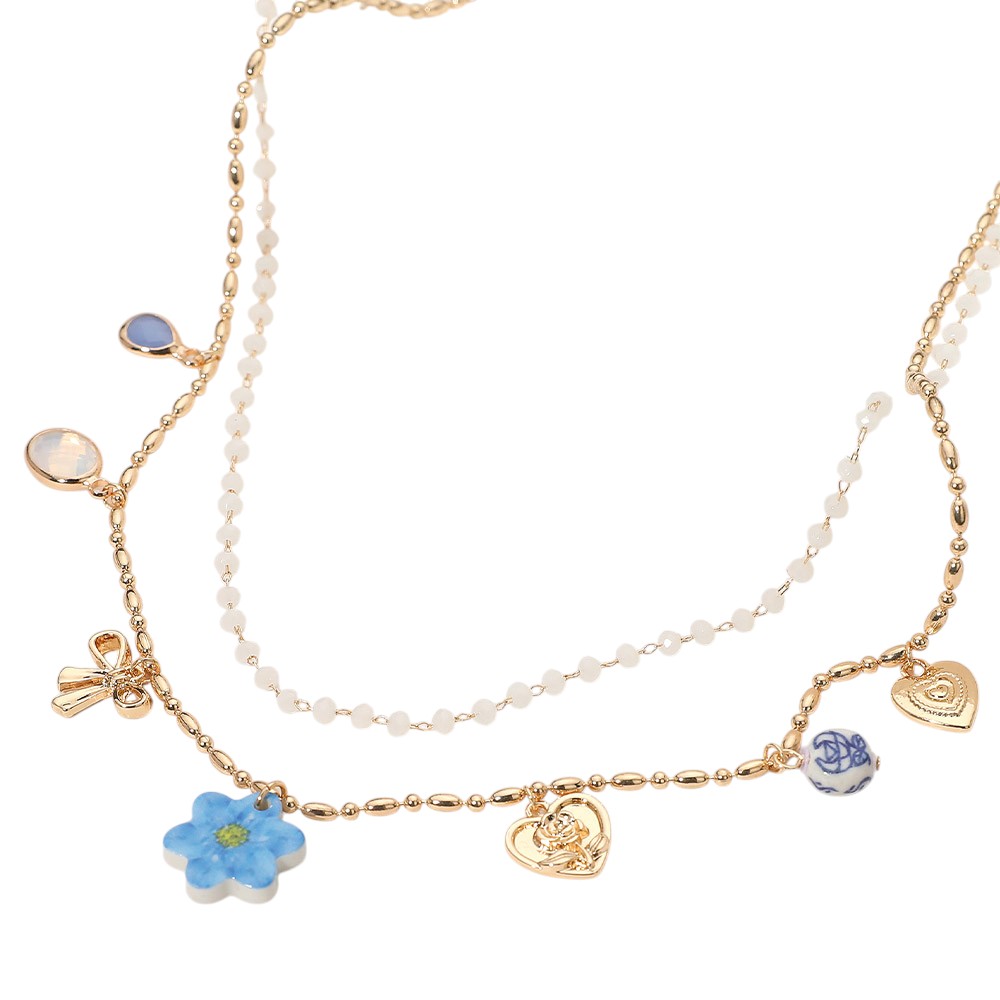 • This layered beaded necklace combines elegant charm accents with delicate detailing for a whimsical and feminine touch. Featuring floral and heart pendants, it adds playful sophistication to any outfit, making it a perfect accessory for casual, romantic, or chic styles.