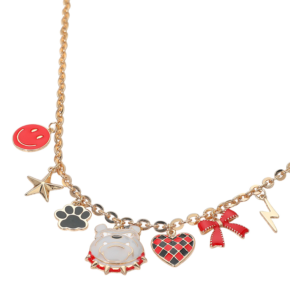 Details • Necklace Size : 18" + 3.25" L • Decor Size : 1.2" L • Necklace featuring playful gameday charms including team mascot animal, paw, heart, bow, star, lightning bolt, and smiley face. A spirited accessory to show team pride, add personality, and complete sporty gameday outfits. • Lead and Nickel Compliant