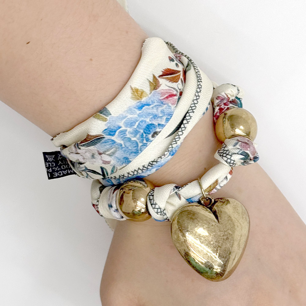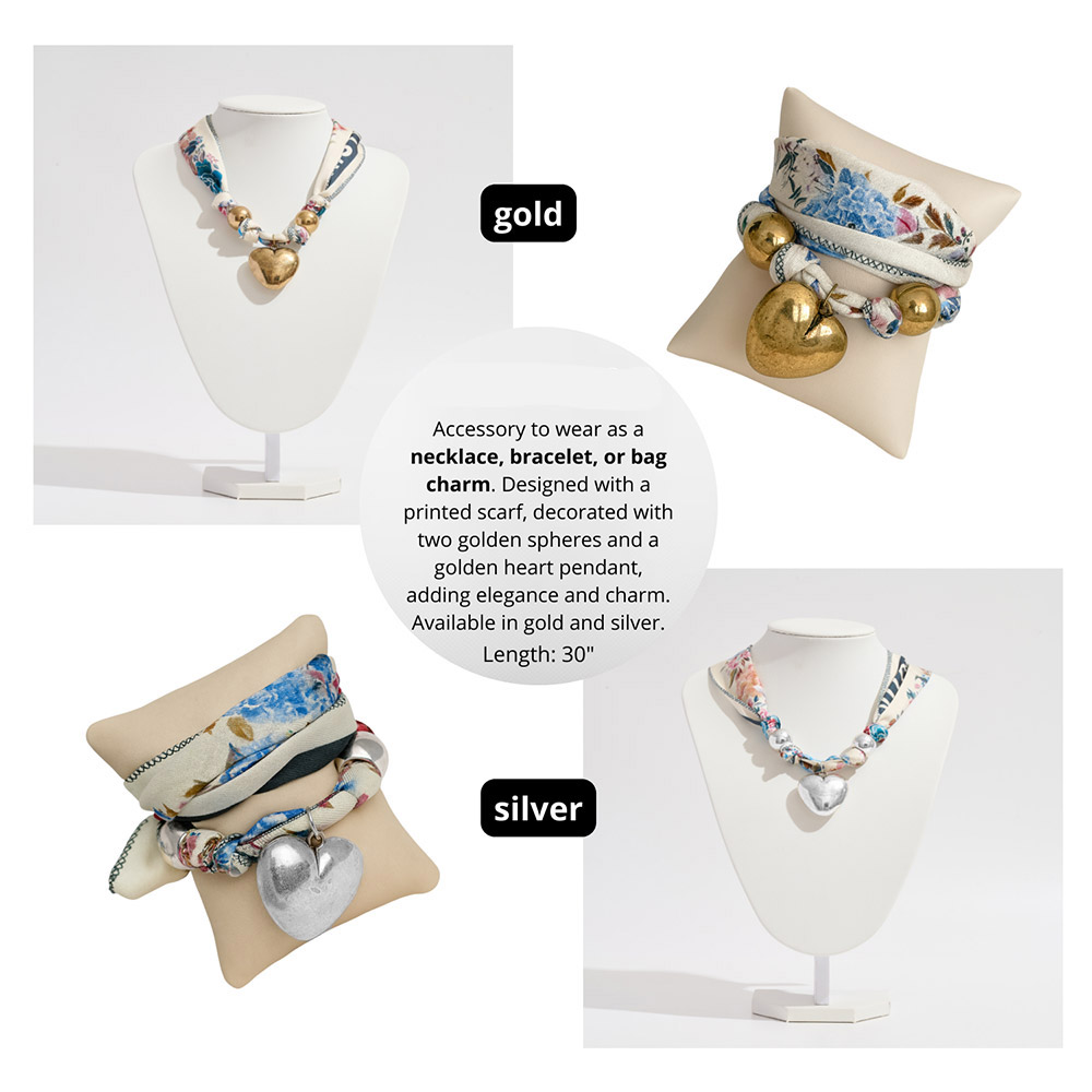 Details • Size : 30" L • Charm Size : 1.75" L • Print may vary • A stylish accessory designed to be worn as a necklace, bracelet, or bag charm. Crafted with a printed scarf and accented with spheres and a bold heart pendant, it adds elegance and versatility. Available in gold or silver for chic everyday or statement styling. • Brass • Gold Dipped • Hypoallergenic • Lead and Nickel Compliant • Made In Korea