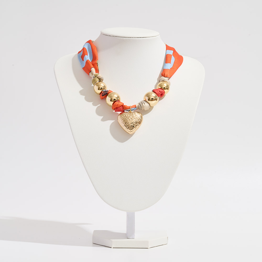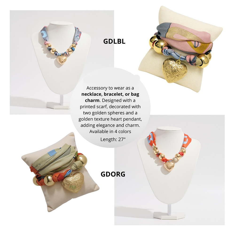 • Versatile scarf accessory styled as a necklace, bracelet, or bag charm. Features a printed scarf with two bold spheres and a textured heart pendant for elegance and charm. Available in 4 unique designs to suit every look, this multifunctional piece adds sophistication.
