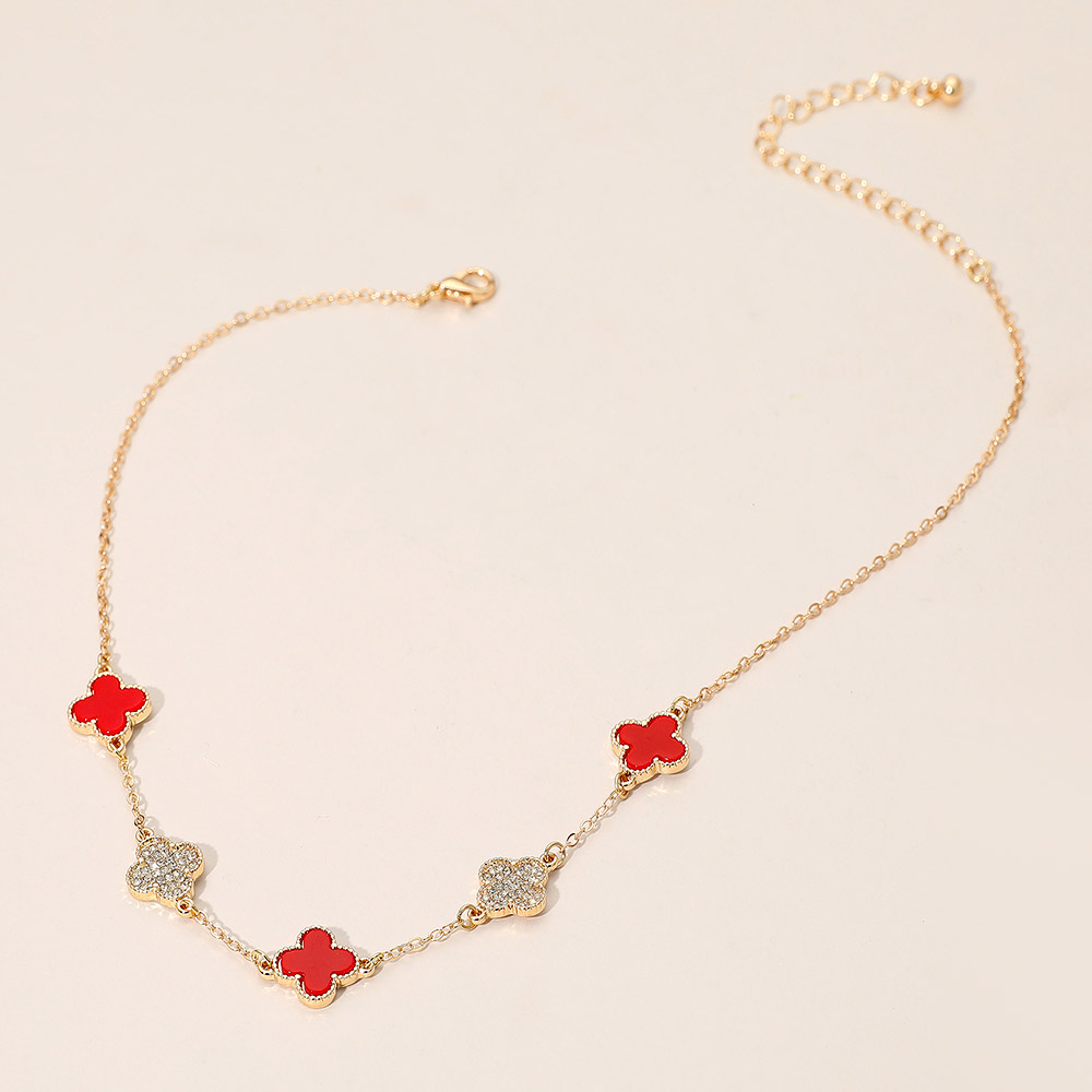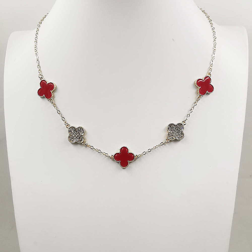 Details • Necklace Size : 15.5" + 3" L • Decor Size : 0.5" L • Add refined elegance to any outfit with this clover charm necklace featuring alternating enamel and crystal-accented charms. Designed with a sleek chain and timeless motif, it’s a versatile piece that complements both casual and dressy looks with effortless sophistication. • Gold Dipped • Lead and Nickel Compliant