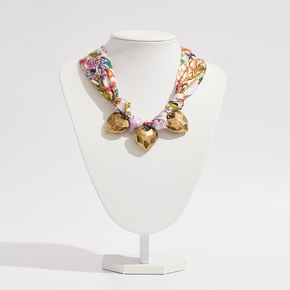 • A versatile accessory that can be styled as a necklace, bracelet, or bag charm. Featuring a printed scarf adorned with three bold heart pendants, it adds elegance and personality. Available in gold or silver, this multifunctional design enhances any look with sophistication.