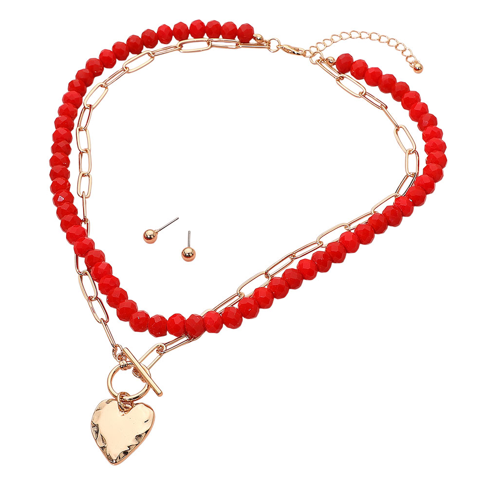 Hammered Metal Heart Toggle Pendant Accent Paperclip Beaded Chain Layered Necklace