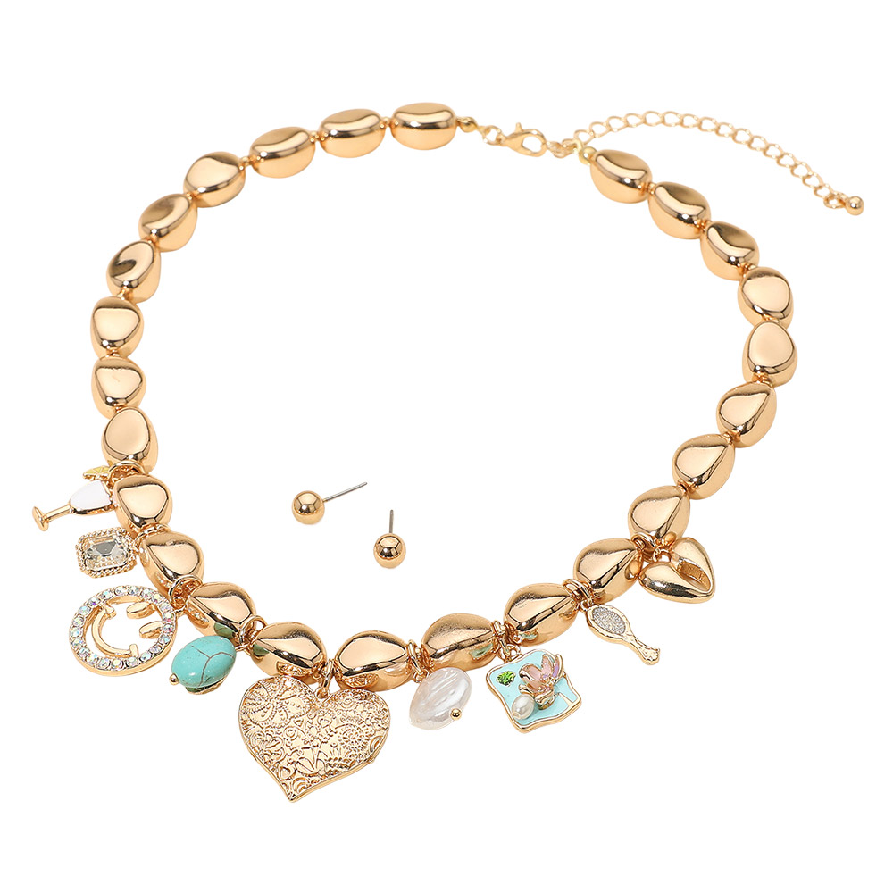 Details • Necklace Size : 16" + 3" L • Decor Size : 1.25" L • Earrings Size : 0.25" L • Elevate your look with this playful beaded necklace featuring a collection of charming pendants that add personality and style to any outfit. Paired with simple stud earrings, this set blends elegance and fun, making it perfect for casual wear, special events, and unique statement looks. • Lead and Nickel Compliant
