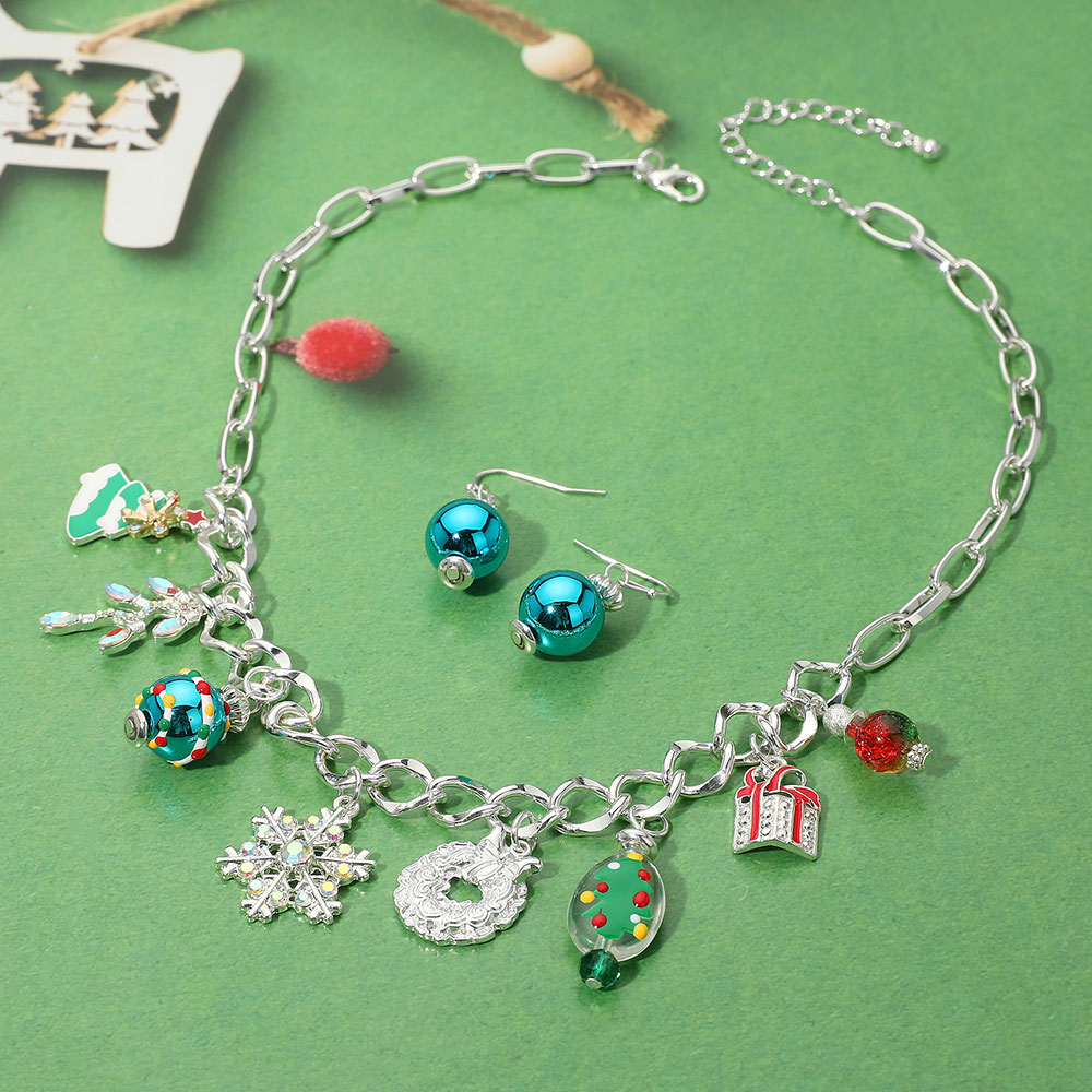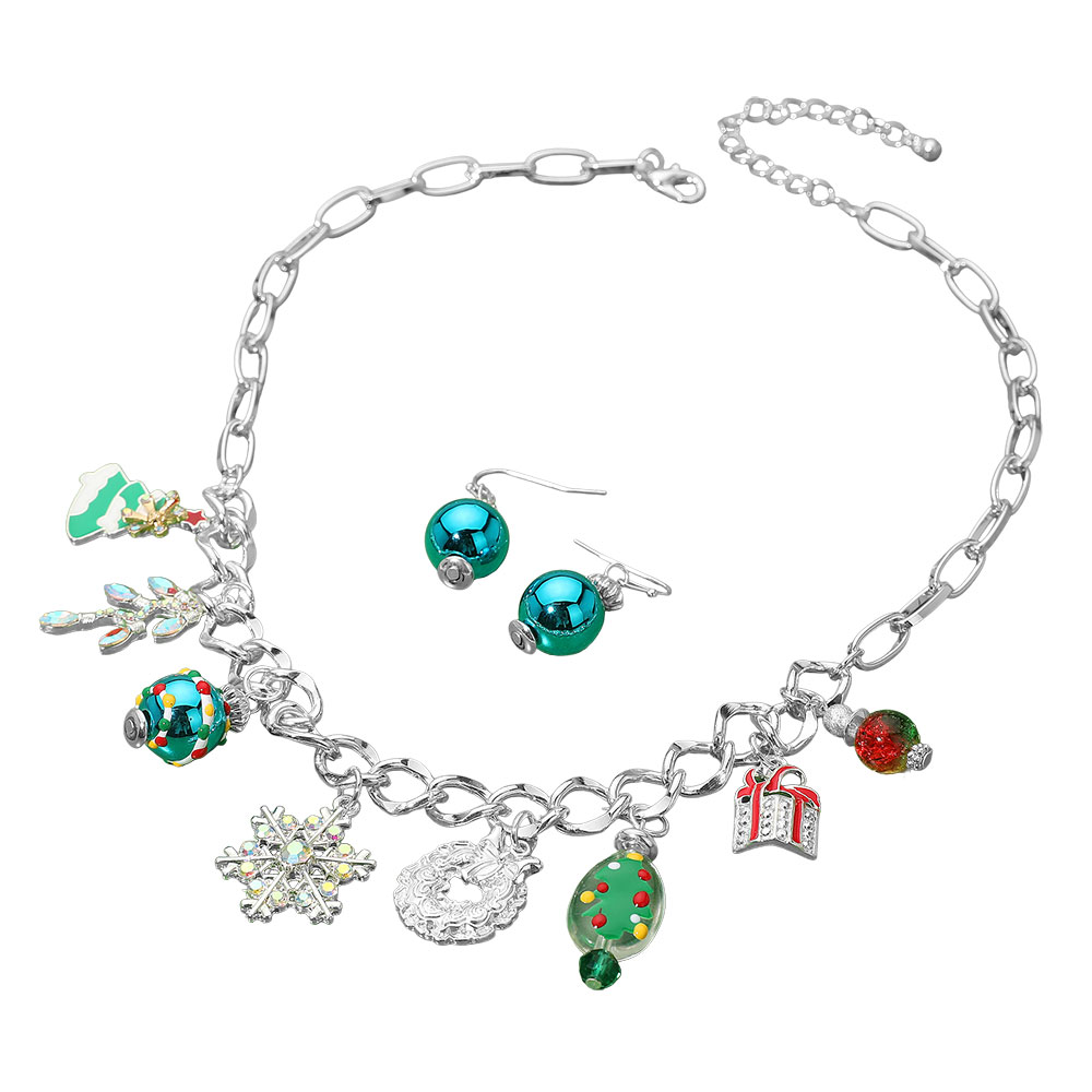 Details • Necklace Size : 18" + 3" L • Decor Size : 1.75" L • Earrings Size : 1.5" L • Holiday charm jewelry set featuring a playful necklace with seasonal pendants and matching drop earrings. A whimsical and sparkling accessory perfect for parties, gifting, and celebrating in festive style. • Lead and Nickel Compliant