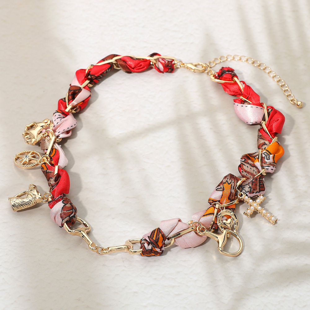 Details • Necklace Size : 16" + 3.25" L • Decor Size : 1.2" L • Pattern May Vary • Stand out with this scarf necklace adorned with gold charms including a cross, horseshoe, and nautical accents. A creative mix of fabric and metal, this bold accessory brings chic detail and playful elegance to any fashion-forward outfit. • Lead and Nickel Compliant