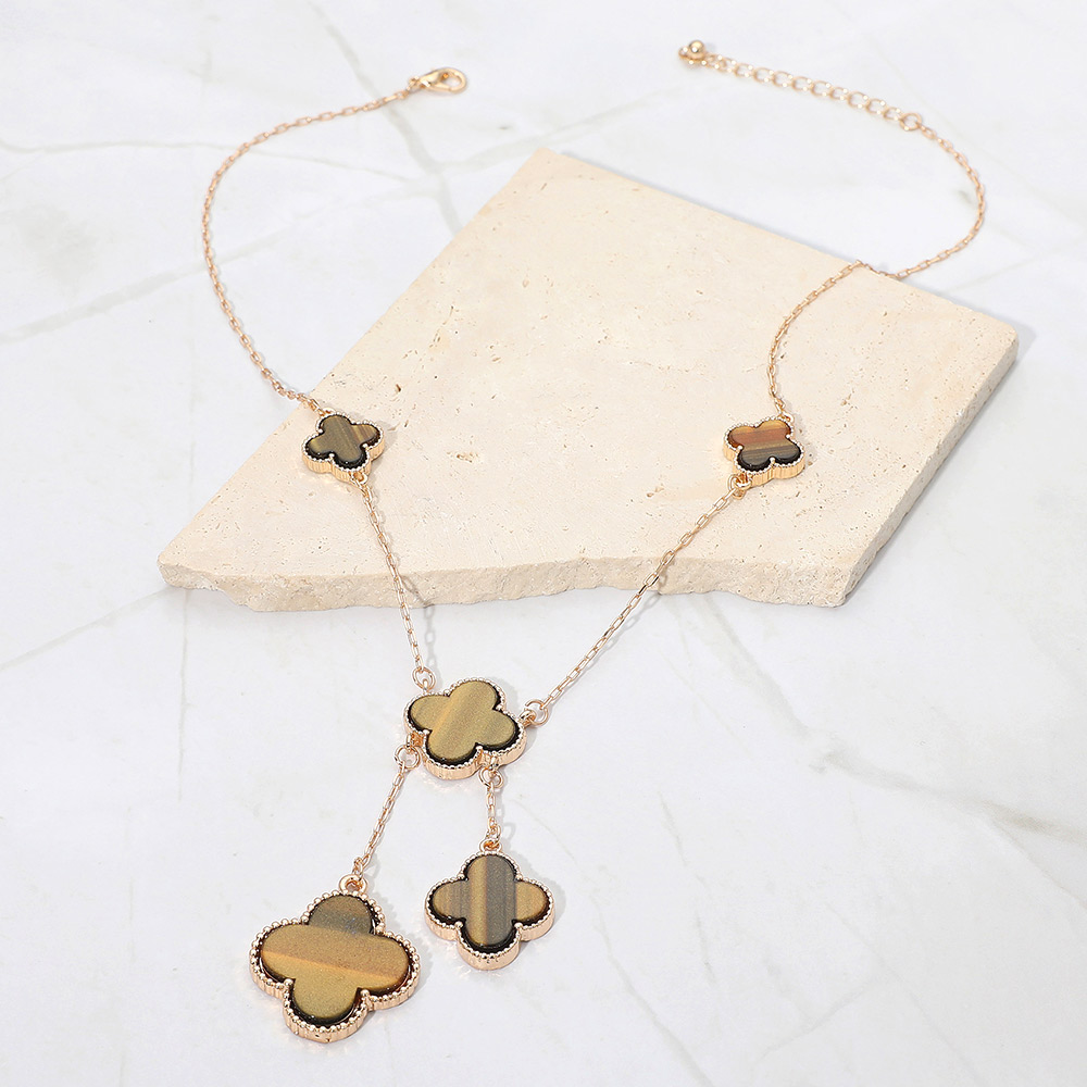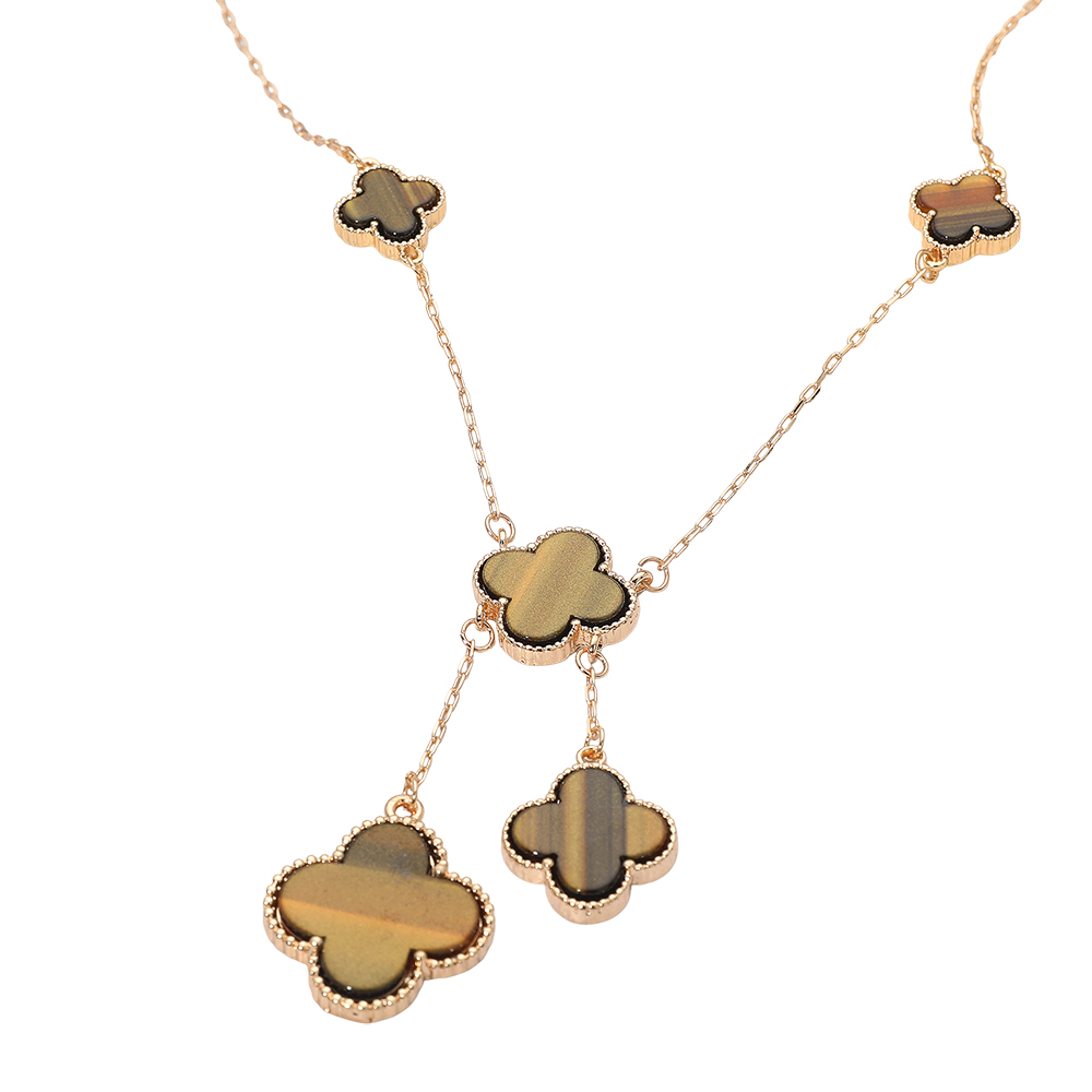Details • Necklace Size : 16" + 2" L • Decor Size : 3" L • Stylish necklace featuring multiple quatrefoil pendants in a cascading layered design. The elegant drop detail adds movement and sophistication, making it perfect for both casual and formal wear, offering a timeless charm that enhances any outfit effortlessly. • Lead and Nickel Compliant