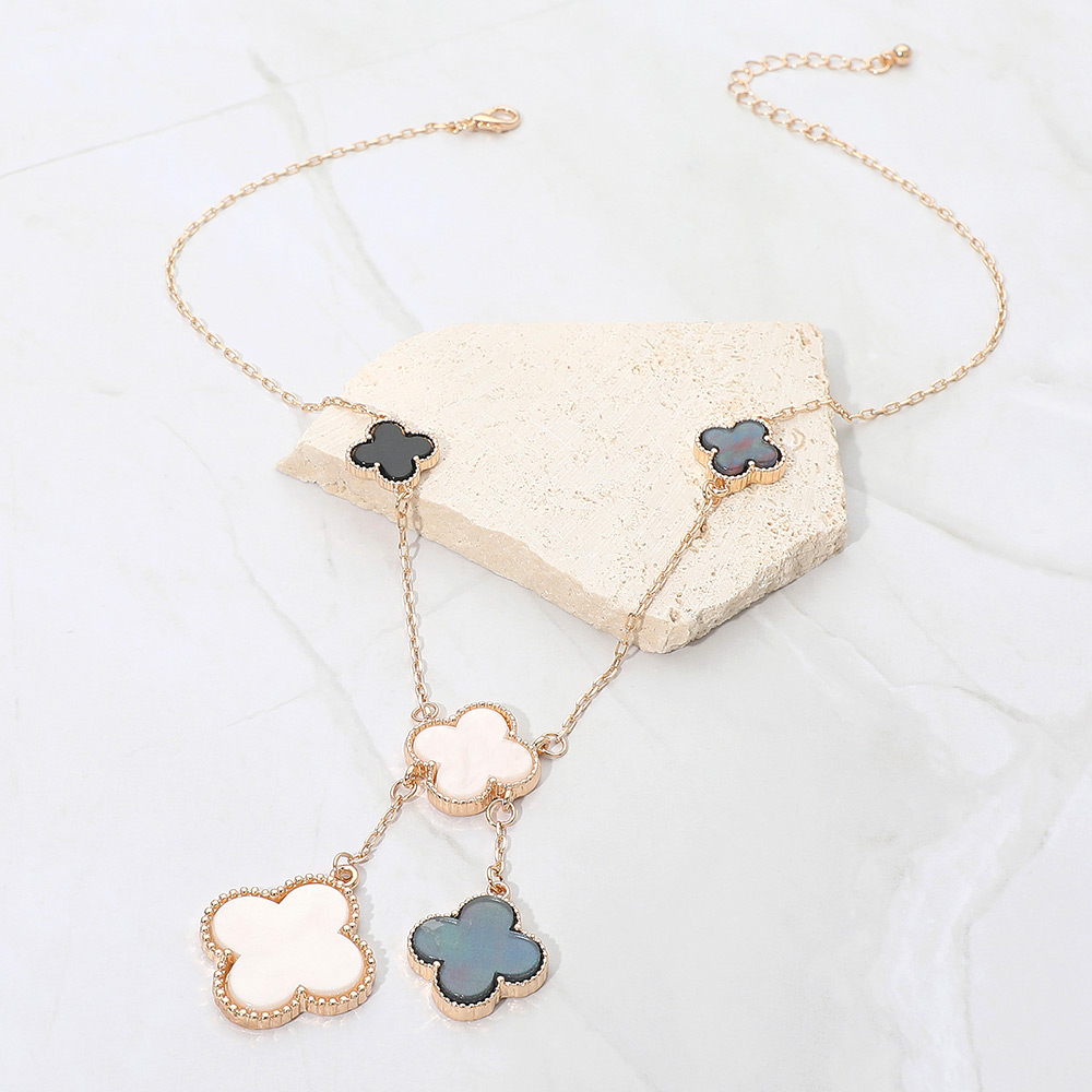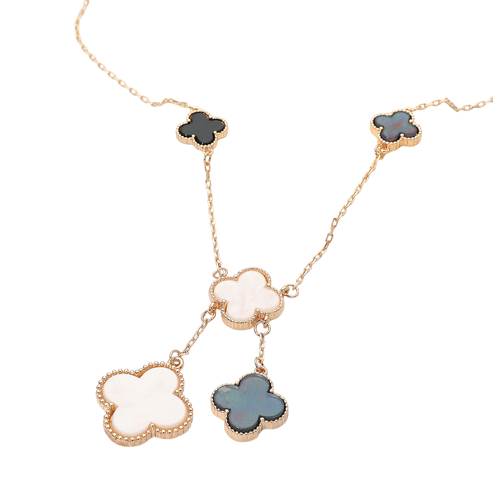 Details • Necklace Size : 16" + 2" L • Decor Size : 3" L • Stylish necklace featuring multiple quatrefoil pendants in a cascading layered design. The elegant drop detail adds movement and sophistication, making it perfect for both casual and formal wear, offering a timeless charm that enhances any outfit effortlessly. • Lead and Nickel Compliant