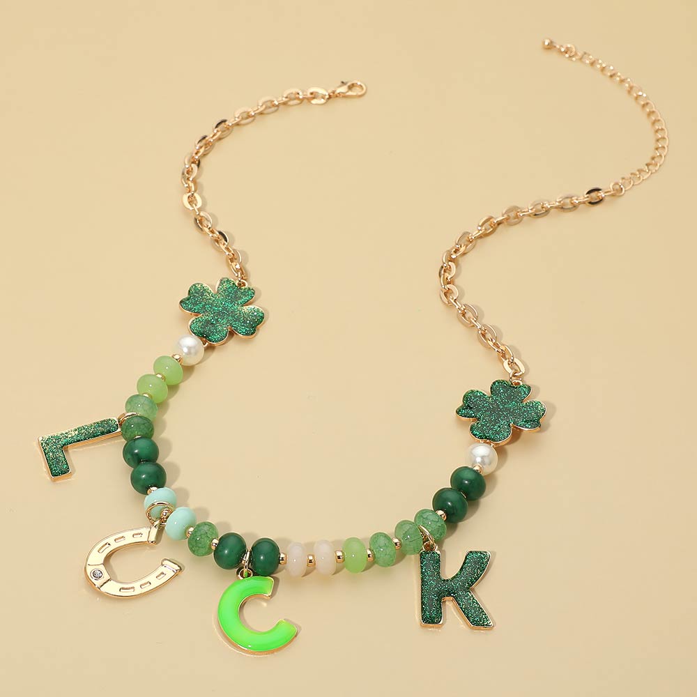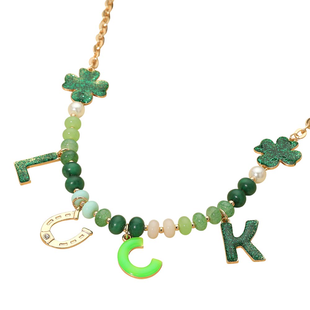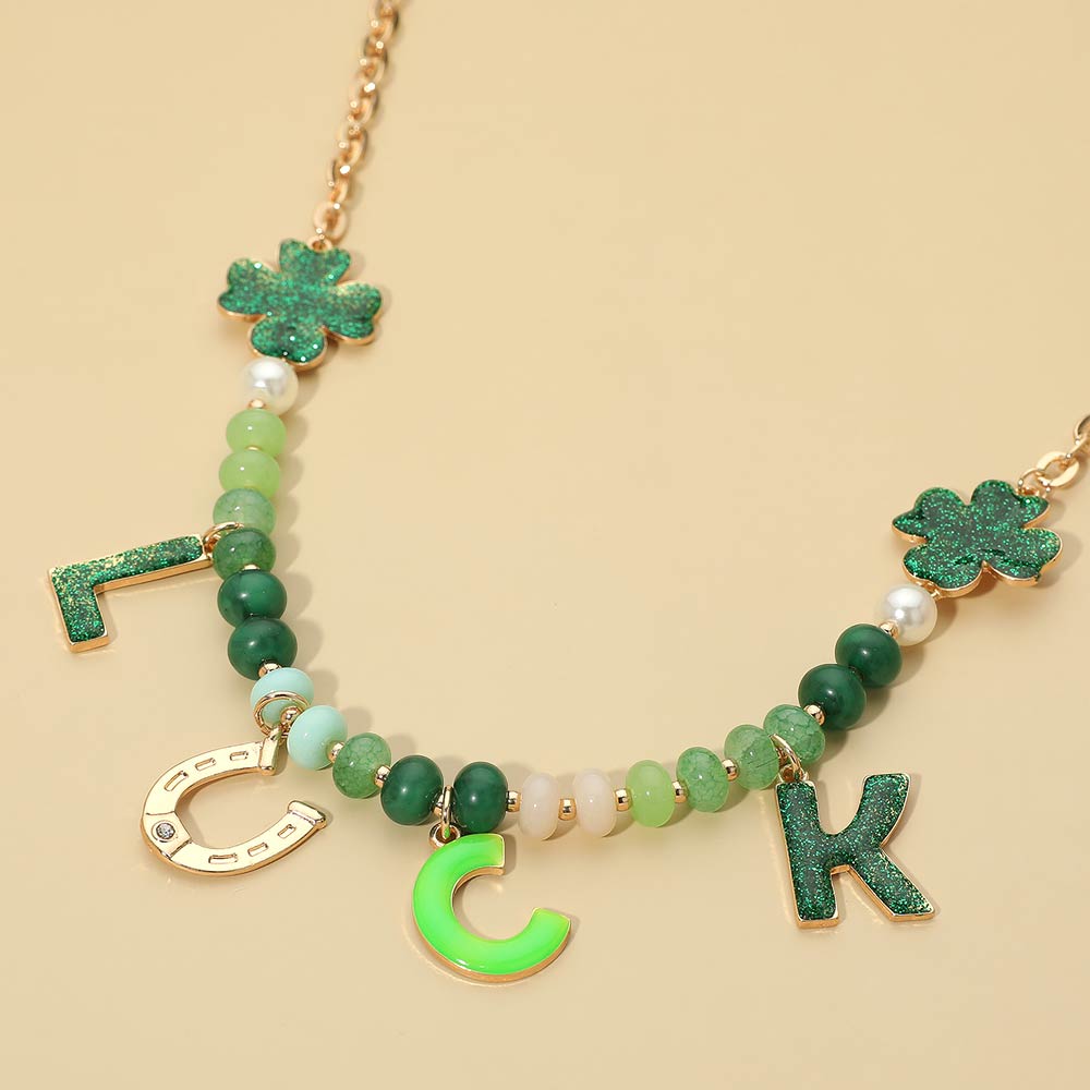 Details • Necklace Size : 17" + 3.25" L • Decor Size : 1" L • This luck letter charm necklace features playful alphabet accents, symbolic charms, and smooth beads arranged along a lightweight chain for an eye-catching statement. Designed for themed gifting, seasonal displays, and everyday styling, it adds personality and movement while remaining easy to layer with other favorite accessories. • Lead and Nickel Compliant