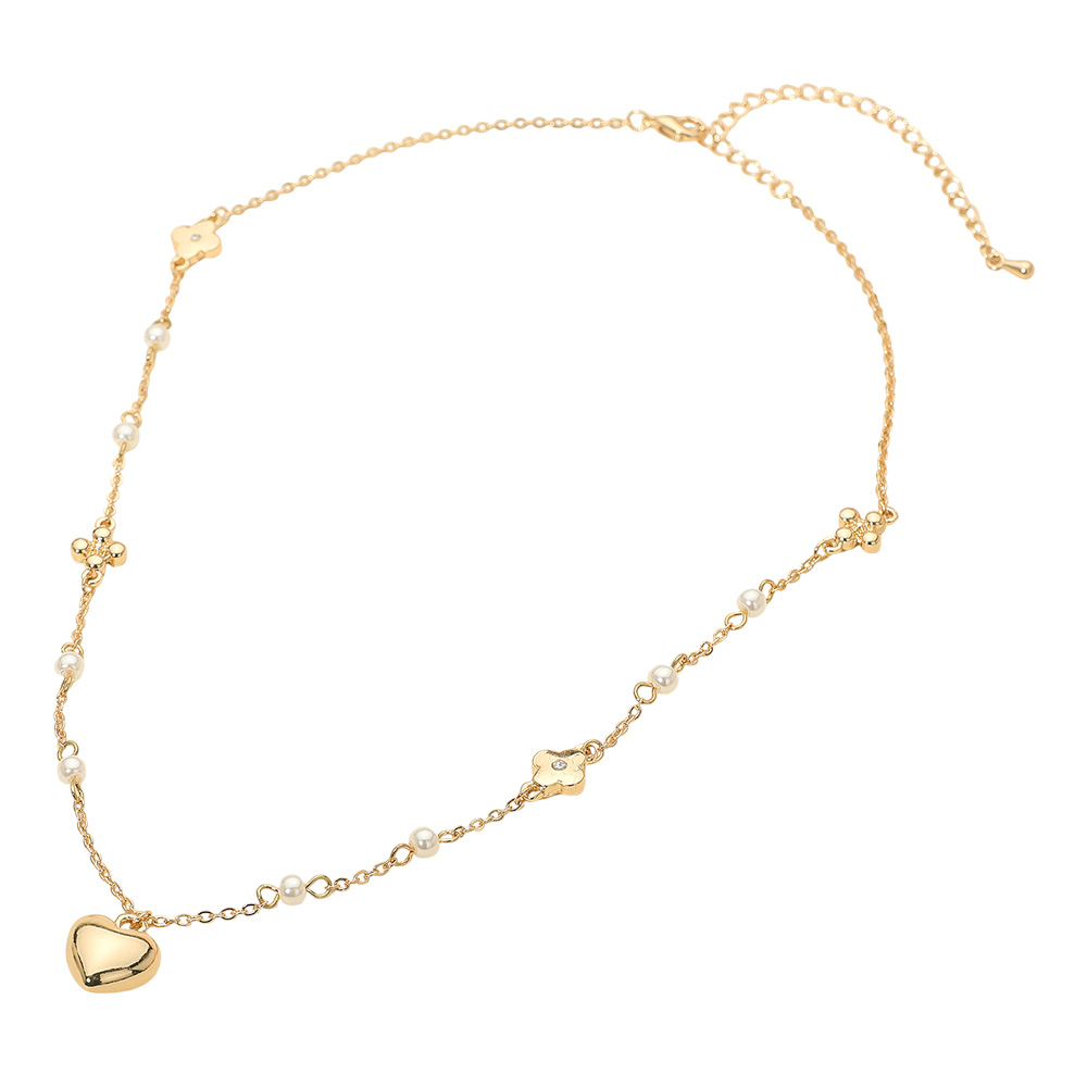 Details • Necklace Size : 16" + 3.5" L • Decor Size : 0.7" L • Elegant chain necklace featuring a dainty heart pendant, small bead accents, and floral-inspired details. Perfect for layering or wearing alone, this necklace adds charm and sophistication to any look. • Lead and Nickel Compliant
