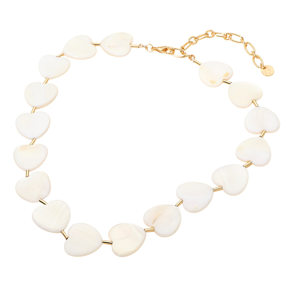 Details • Necklace Size : 17" + 3" L • Decor Size : 0.8" L • This elegant necklace features a strand of smooth heart-shaped beads arranged in a clean, modern silhouette. Its charming design adds a soft, romantic touch to any outfit, making it a versatile accessory for both everyday wear and elevated looks. • Lead and Nickel Compliant