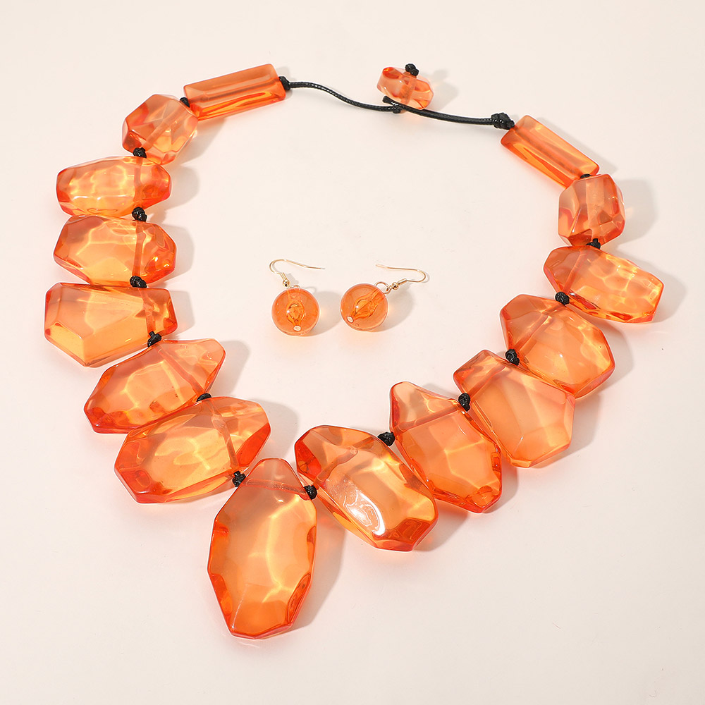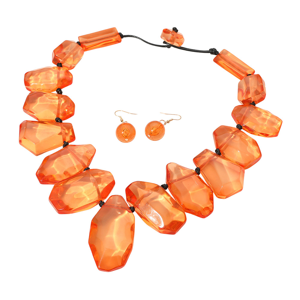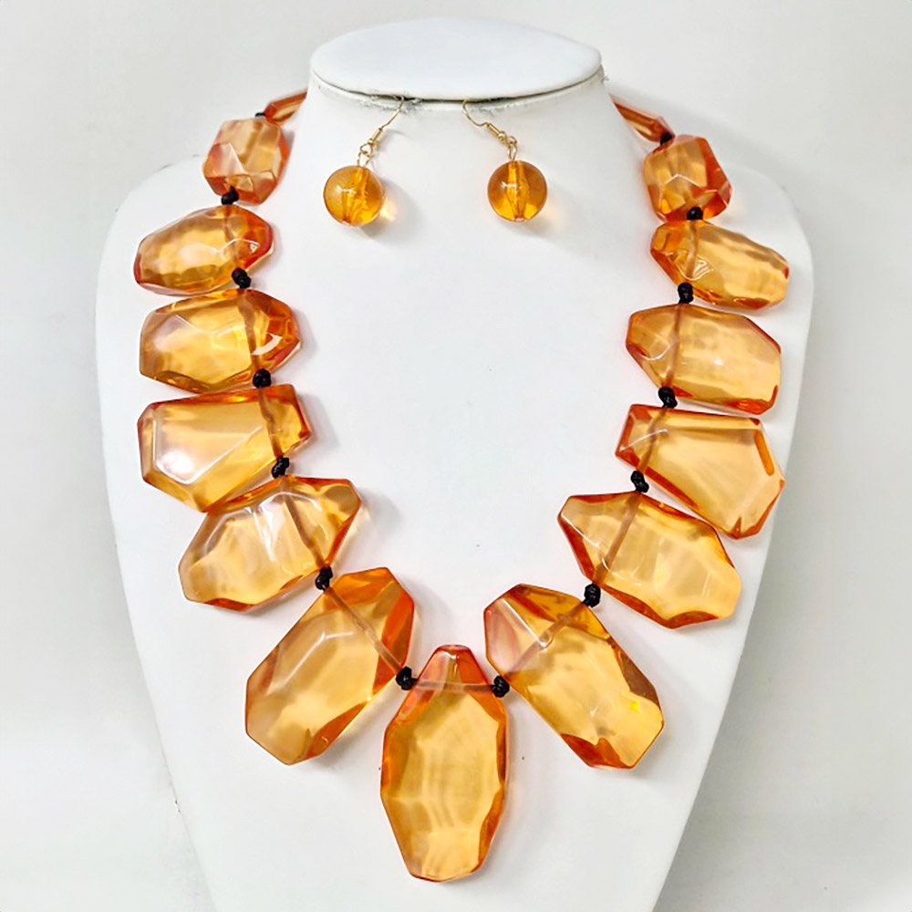 Details • Necklace Size : 21.5" + 2.5" L • Decor Size : 2.5" L • Earrings Size : 1.75" L • Bold faceted necklace and matching earrings set with oversized geometric beads. This eye-catching duo is perfect for adding drama to evening looks or elevating any outfit with striking, sculptural style. • Lead and Nickel Compliant