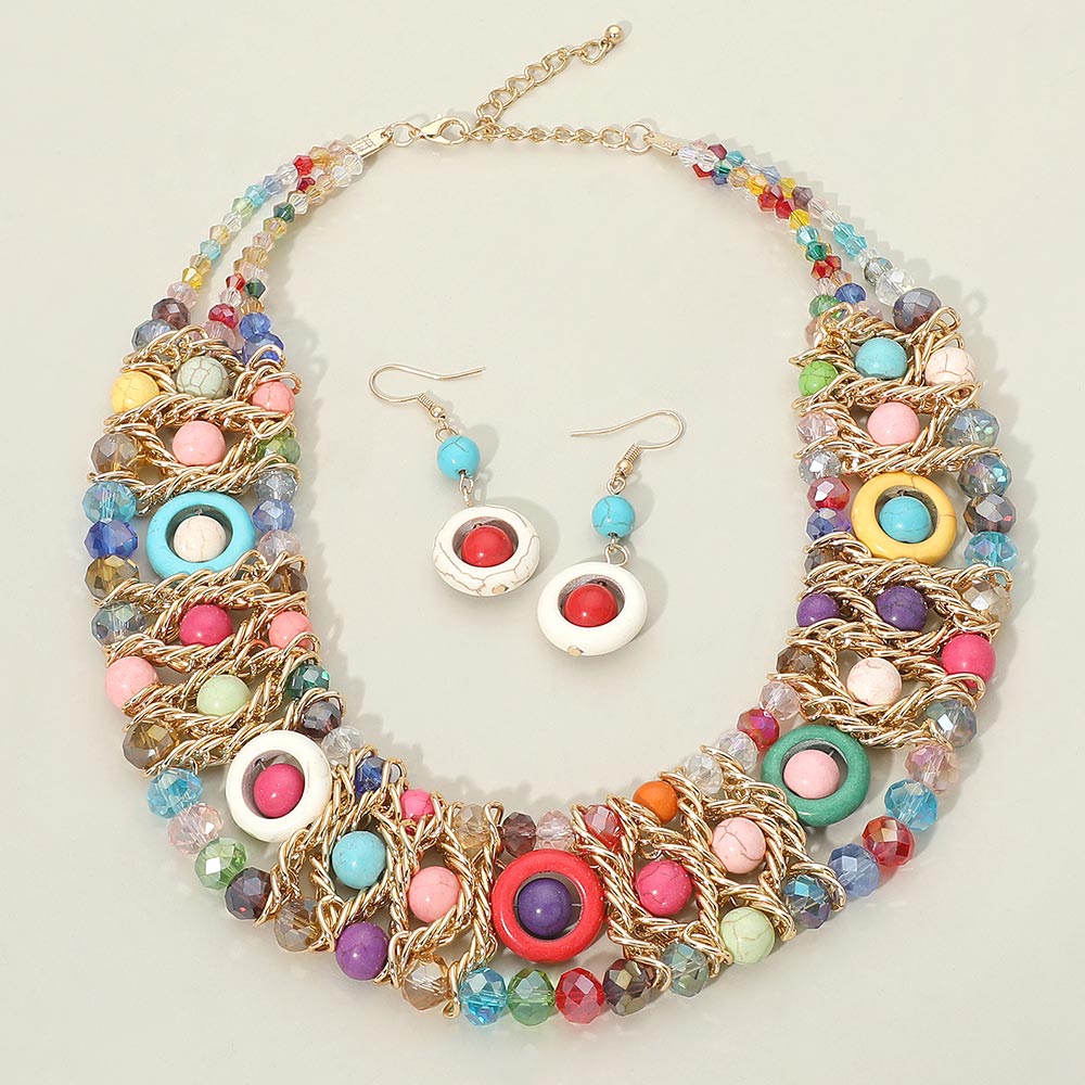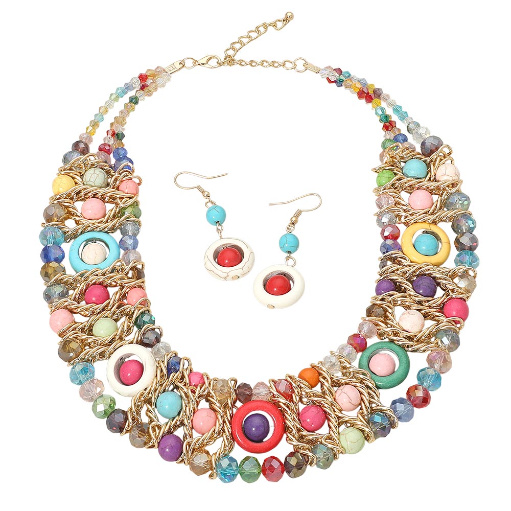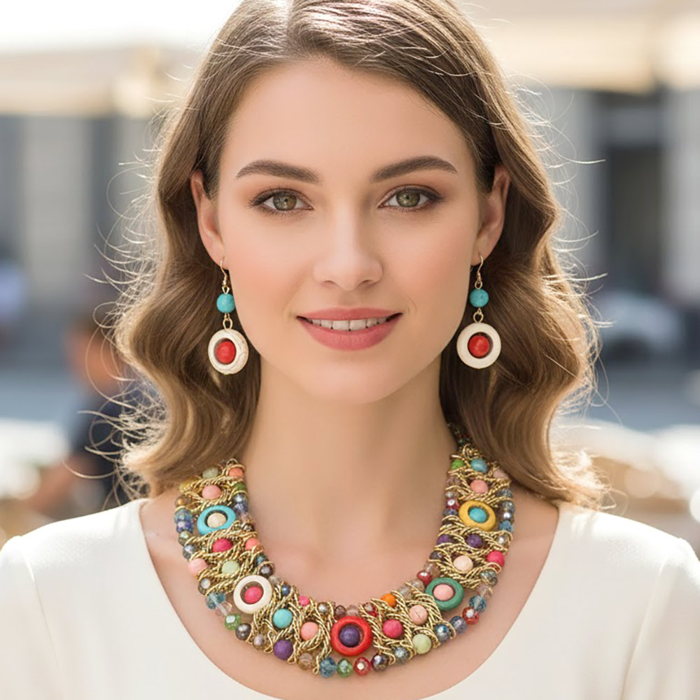 • Eye-catching multi strand statement necklace set featuring layered beaded details with matching drop earrings. Designed for bold boutique styling, festival outfits, and standout event looks. A fashion-forward jewelry set that adds texture, movement, and artistic flair to dresses, tops, and resort wear collections.