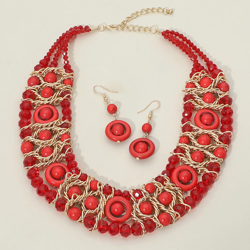• Eye-catching multi strand statement necklace set featuring layered beaded details with matching drop earrings. Designed for bold boutique styling, festival outfits, and standout event looks. A fashion-forward jewelry set that adds texture, movement, and artistic flair to dresses, tops, and resort wear collections.