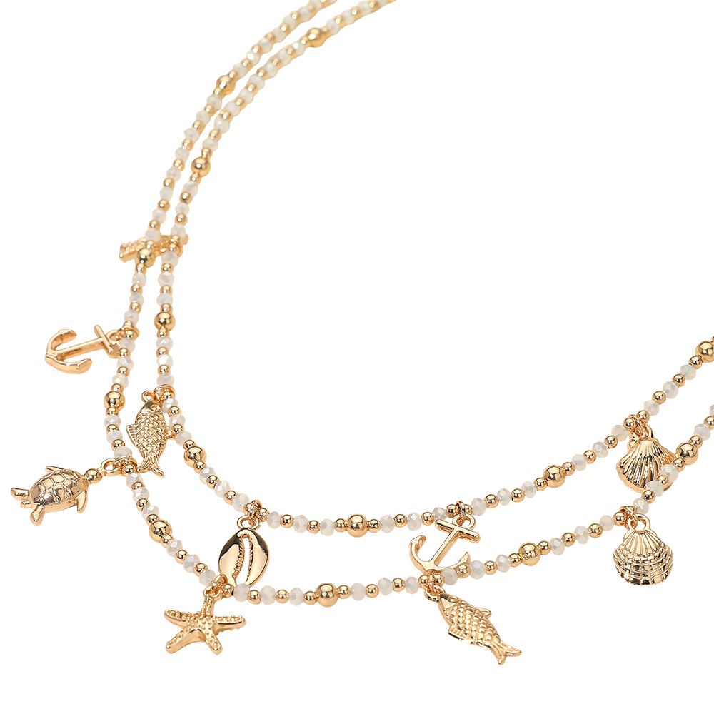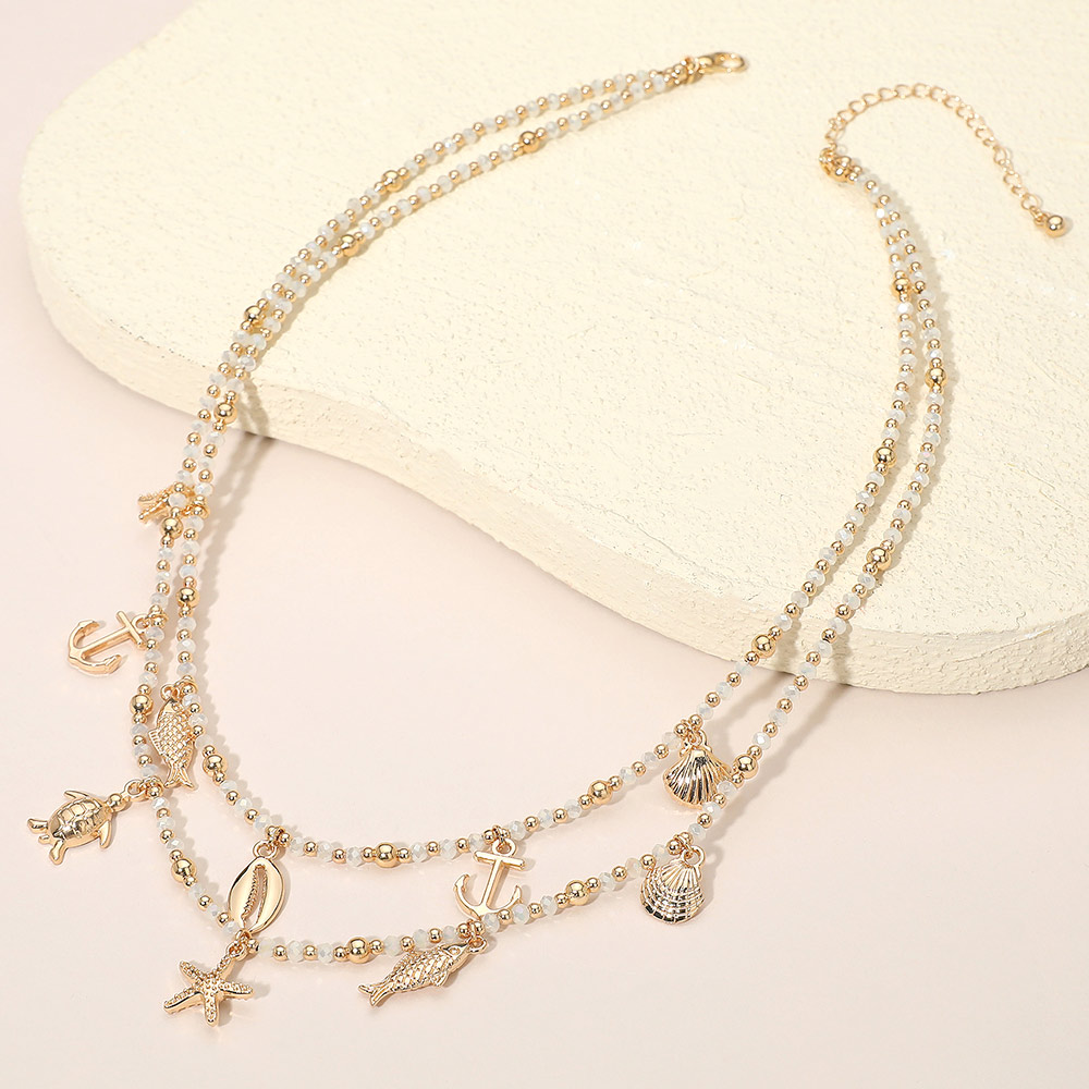 Details • Necklace Size : 16.5" + 3" L • Decor Size : 2" L • This layered beaded necklace features charming ocean-inspired pendants including seashells, fish, and anchors. A stylish accessory that brings a touch of coastal elegance to your look, perfect for adding playful detail to everyday or vacation outfits. • Lead and Nickel Compliant