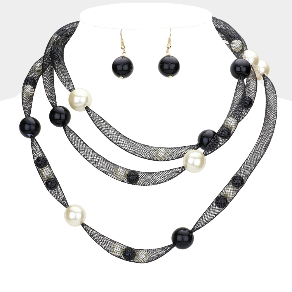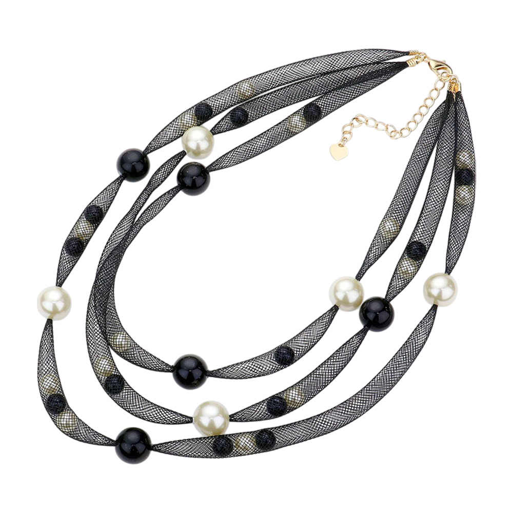 Pearl Accented Triple Layered Mesh Bib Necklace