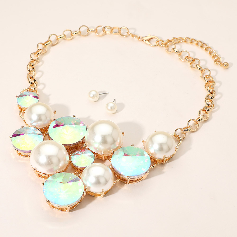 Details • Necklace Size : 19" + 3" L • Decor Size : 3.5" L • Earrings Size : 0.4" L • This elegant statement necklace features lustrous pearl-like accents paired with shimmering gemstones for a radiant finish. Complete with matching stud earrings, it offers a perfect blend of sophistication and glamour, ideal for weddings, galas, or upscale evening looks. • Lead and Nickel Compliant