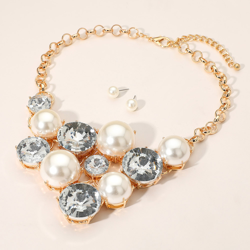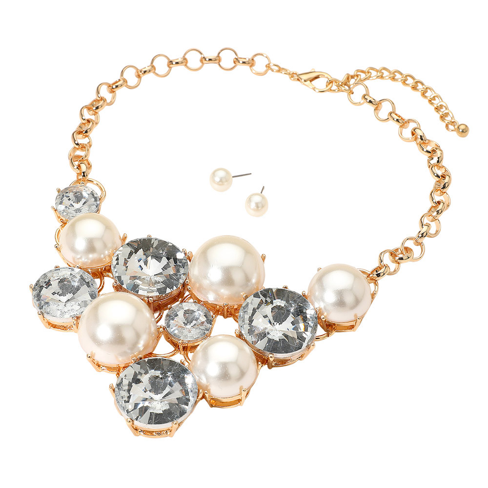 • This elegant statement necklace features lustrous pearl-like accents paired with shimmering gemstones for a radiant finish. Complete with matching stud earrings, it offers a perfect blend of sophistication and glamour, ideal for weddings, galas, or upscale evening looks.