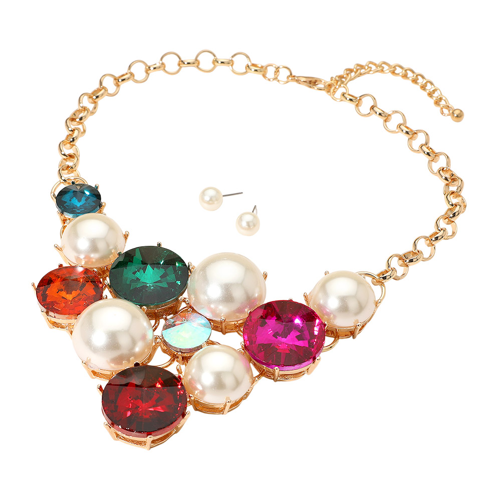 Details • Necklace Size : 19" + 3" L • Decor Size : 3.5" L • Earrings Size : 0.4" L • This elegant statement necklace features lustrous pearl-like accents paired with shimmering gemstones for a radiant finish. Complete with matching stud earrings, it offers a perfect blend of sophistication and glamour, ideal for weddings, galas, or upscale evening looks. • Lead and Nickel Compliant