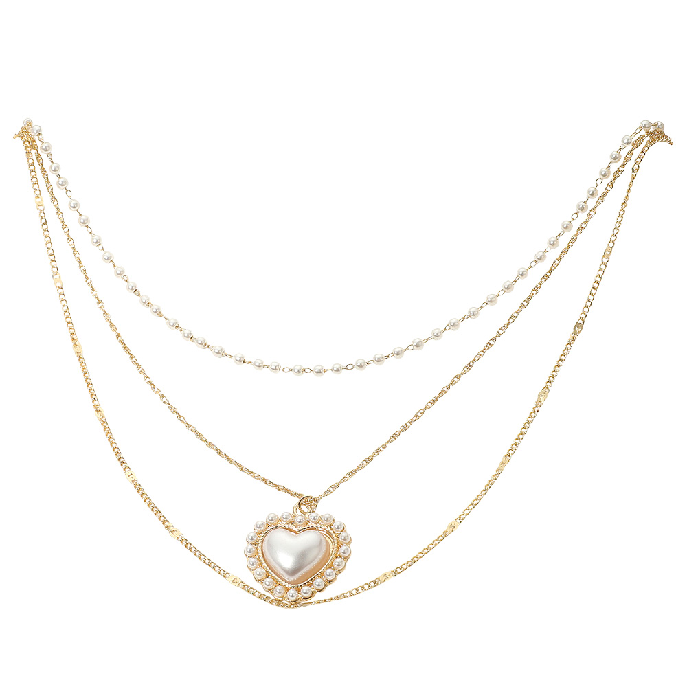 Pearl Heart Pendant Accent Triple Chain Layered Necklace