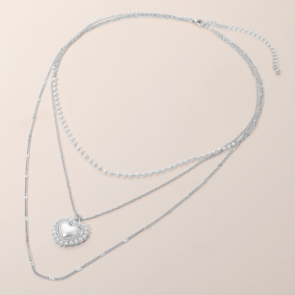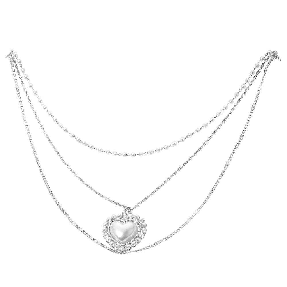 Pearl Heart Pendant Accent Triple Chain Layered Necklace