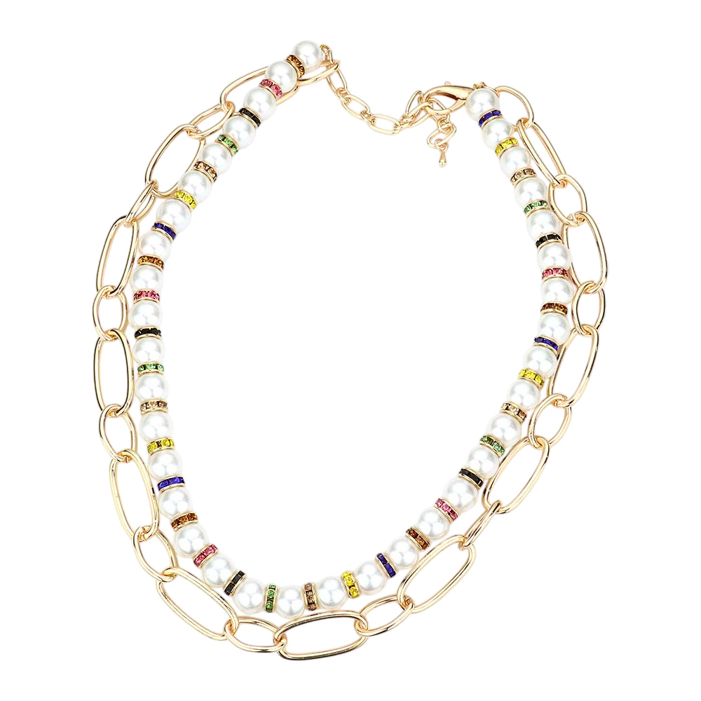 Pearl Open Metal Oval Link Double Layered Necklace